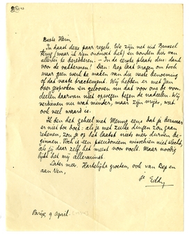 In haast deze paar regels. We zijn net uit Brussel terug (waar ik Nen ontmoet heb) en vonden hier van allerlei te beredderen. - In de eerste plaats dus: dank voor de vaktermen! Dan: Bep laat vragen om toch maar geen werk te maken van die vaste benoeming of dat vaste tractement. Wij hebben er met Jan over gesproken en gelooven nu dat voor ons de voordeelen daarvan niet opwegen tegen de nadeelen. Wij verdienen nu wat minder, maar zijn vrijer, wat ook veel waard is.