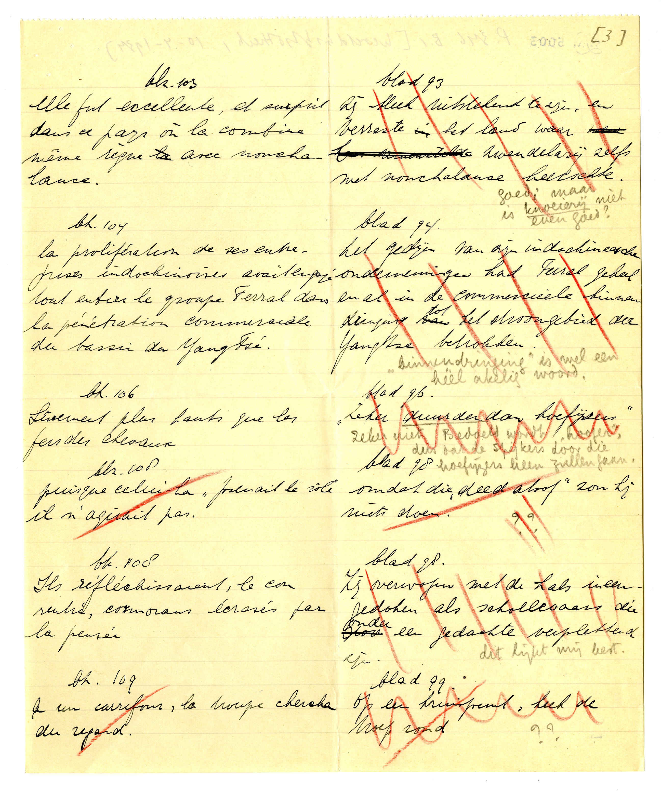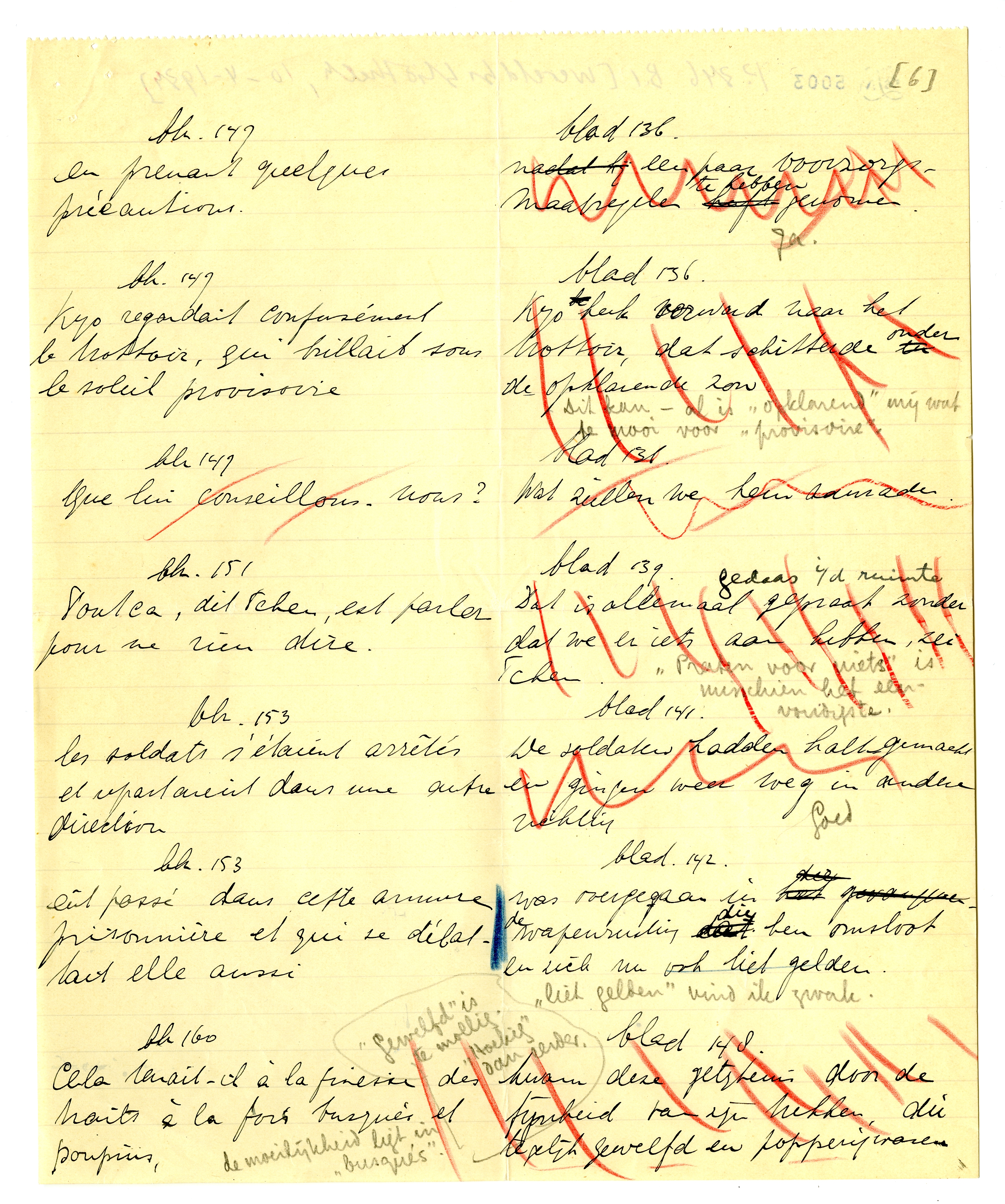 Het speet mij ook dat ik u net misliep. Bij terugkeer hier vond ik uw schrijven, met het lijstje dat ik hierbij terugzend. De moeilijkheid is, dat ik nu mijn eigen vertaling niet onder oogen heb; ik kan dus alleen een ‘tegenproef’ nemen op de vertaling die u voorstelt. Deze is soms goed, soms onjuist; hier en daar bepaald fout. In de meeste gevallen zullen we er dus iets anders op moeten vinden dat èn u èn mij bevredigt, zonder den auteur te verraden. Maar dat schikt zich wel. Als u mijn opmerkingen even leest en daarmee rekening houdt in de veranderingen die u reeds hebt aangebracht, kan ik de rest heel goed op de proeven doen: als alles gedrukt is, zie je het ook weer anders. Ik zal in ieder geval rekening houden met de passages waar u kruisjes bij hebt gezet.