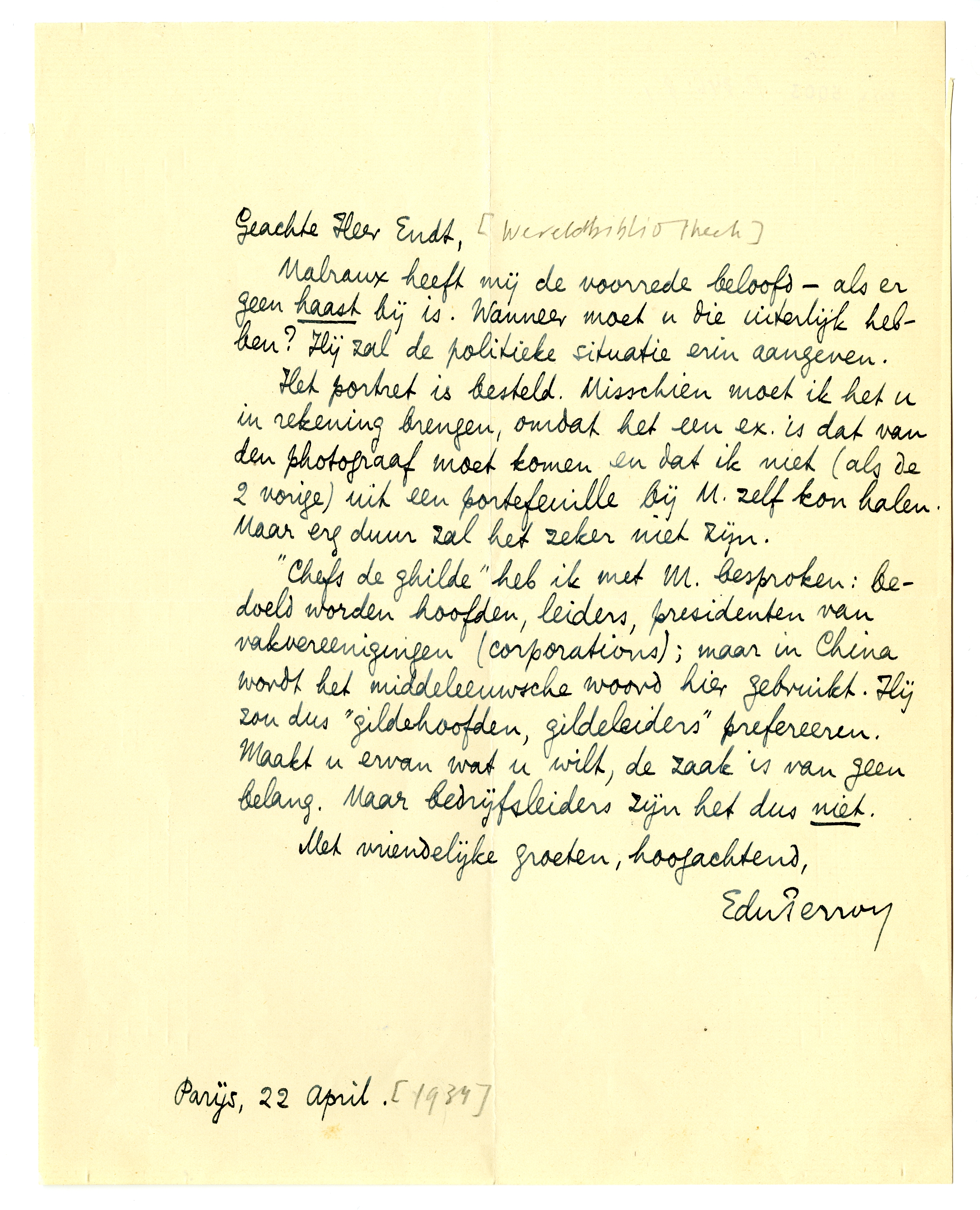 ‘Chefs de ghilde’ heb ik met M. besproken: bedoeld worden hoofden, leiders, presidenten van vakvereenigingen (corporations); maar in China wordt het middeleeuwsche woord hier gebruikt. Hij zou dus ‘gildehoofden, gildeleiders’ prefereeren. Maakt u ervan wat u wilt, de zaak is van geen belang. Maar bedrijfsleiders zijn het dus niet.