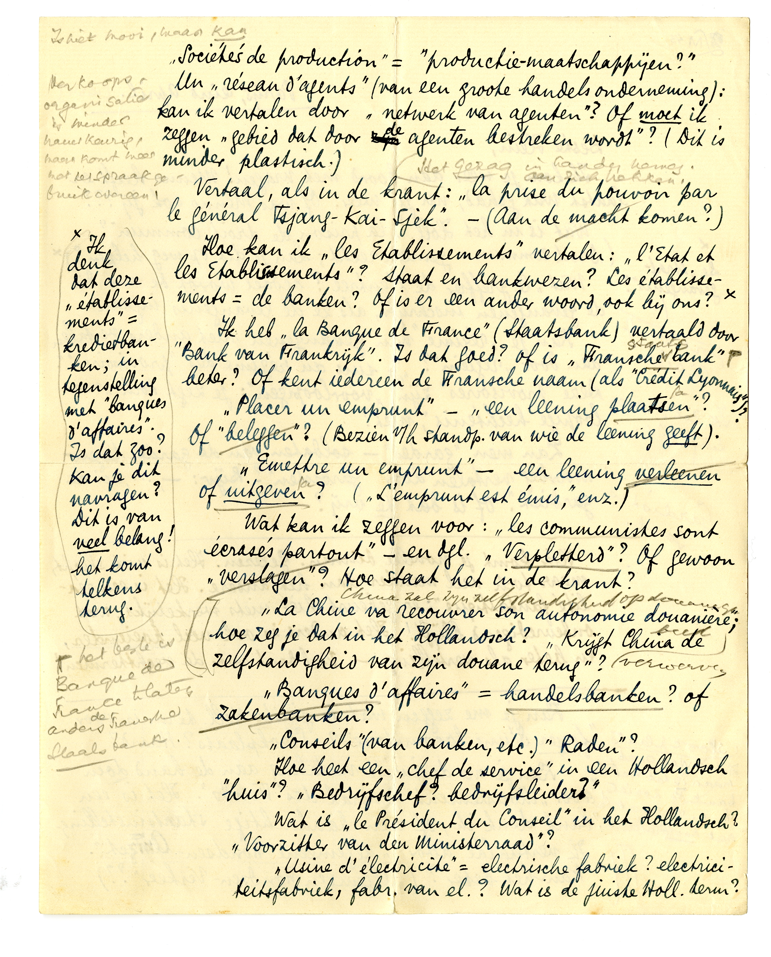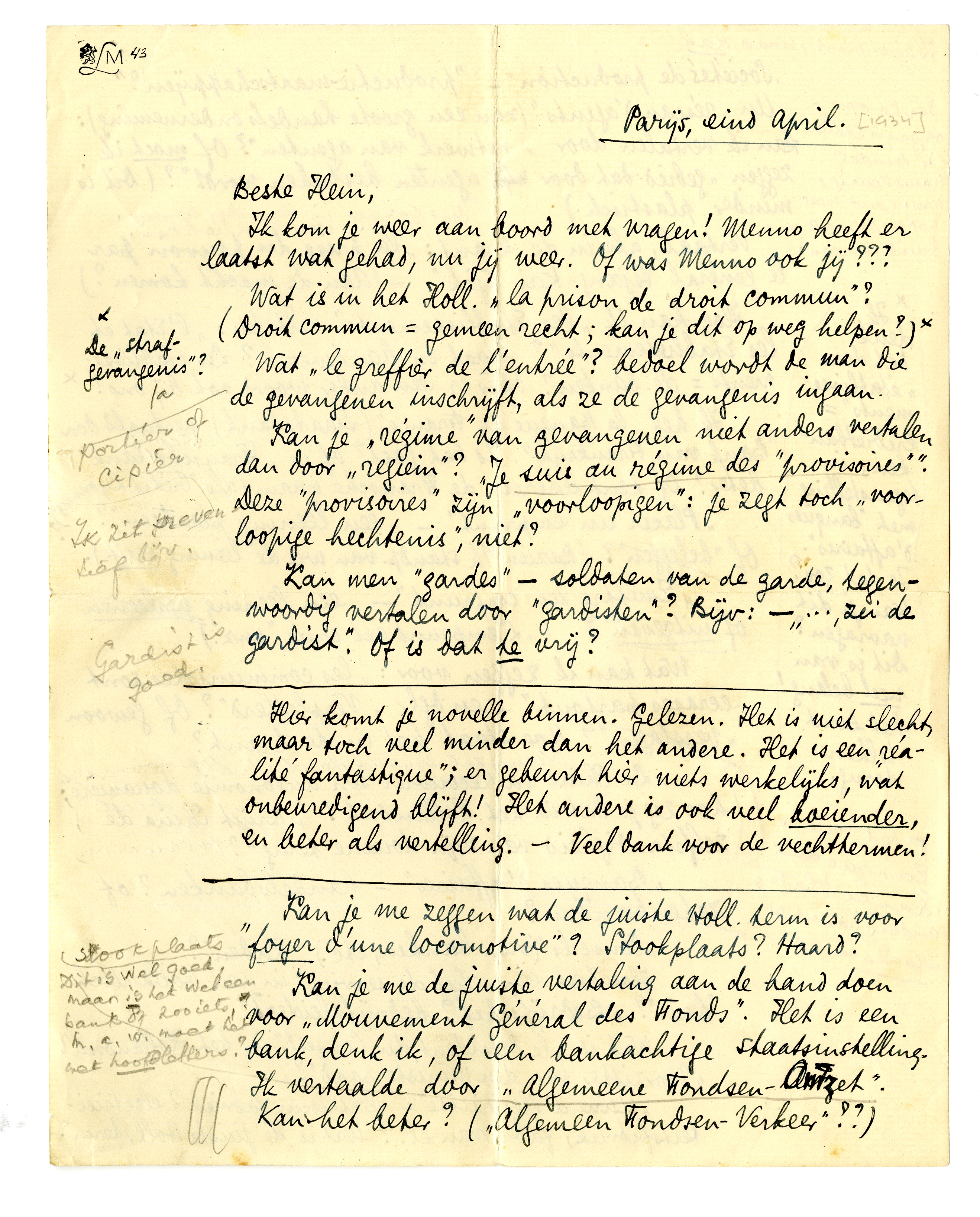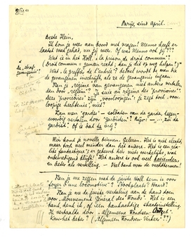 Kan je deze vragenlijst betrekkelijk gauw klaarkrijgen? - zoodra ik namelijk die dingen heb ingevuld, kan mijn laatste stuk naar de W.B. en krijg ik 3/4 van het honorarium. De rest als het boek ver-schenen is. Wel wonderlijk, deze laatste maatregel - is dat soms voor als de vertaler het verdomt de drukproeven na te kijken?...