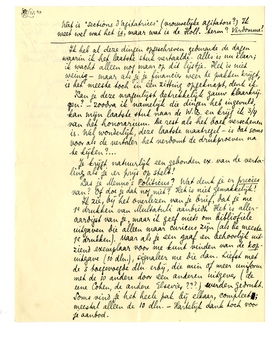 Ik zie, bij het overlezen van je brief, dat je me 1e drukken van Multatuli aanbiedt. Het is alleraardigst van je, maar ik geef niets om bibliofiele uitgaven die alleen maar curieus zijn (als de meeste 1e drukken). Maar als je een gaaf en behoorlijk uitziend exemplaar voor me kunt vinden van de kop-uitgave (10 dln.), signaleer me die dan. Liefst met de 3 toegevoegde dln. erbij, die min of meer uniform met de 10 andere door een anderen uitgever (de eene Cohen, de andere Elsevier???) werden gedrukt. Soms vind je het heele pak bij elkaar, compleet; meestal alleen de 10 dln. - Hartelijk dank toch voor je aanbod.
