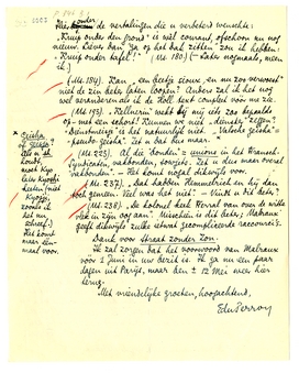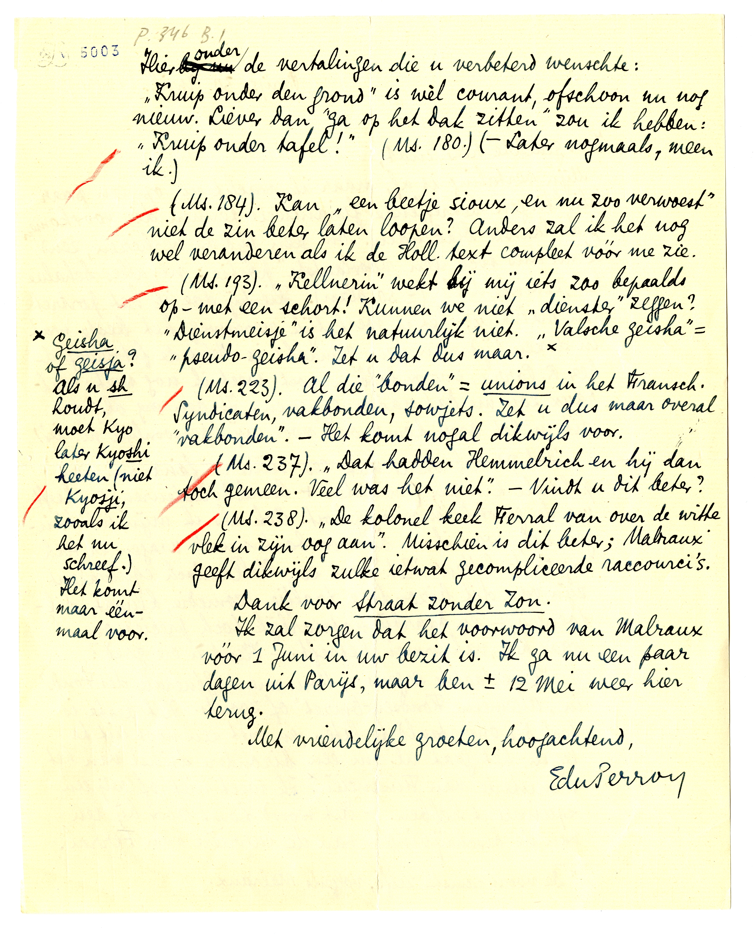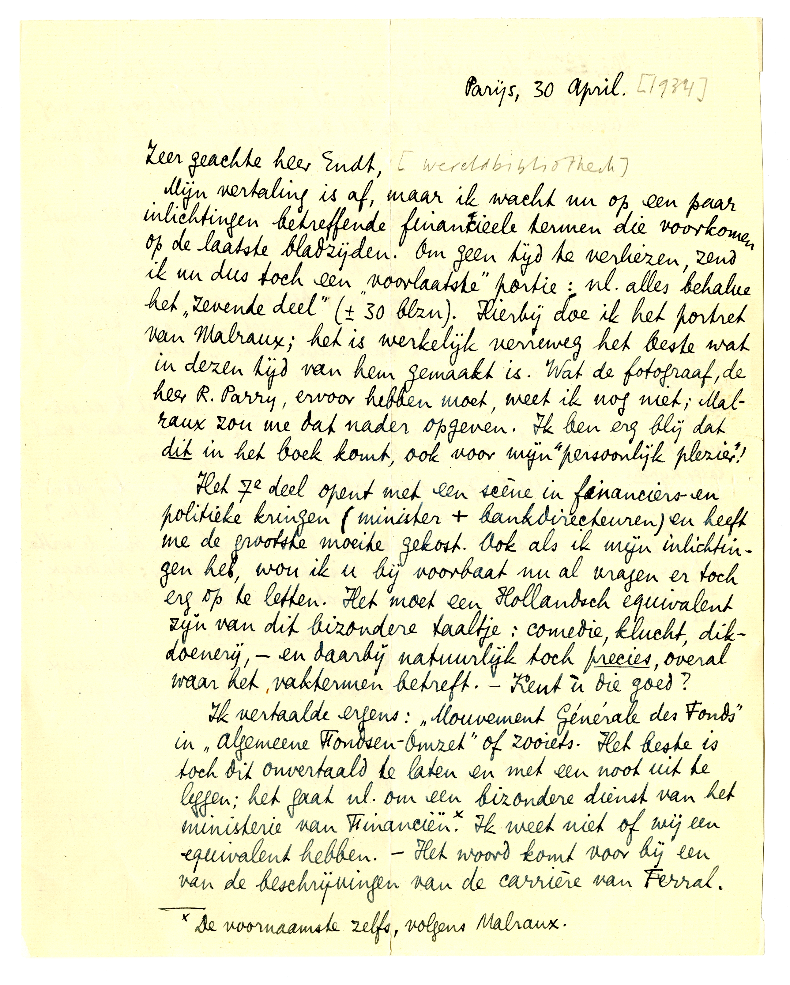 Mijn vertaling is af, maar ik wacht nu op een paar inlichtingen betreffende financieele termen die voorkomen op de laatste bladzijden. Om geen tijd te verliezen, zend ik nu dus toch een ‘voorlaatste’ portie: nl. alles behalve het ‘zevende deel’ (± 30 blzn). Hierbij doe ik het portret van Malraux; het is werkelijk verreweg het beste wat in dezen tijd van hem gemaakt is. Wat de fotograaf, de heer R. Parry, ervoor hebben moet, weet ik nog niet; Malraux zou me dat nader opgeven. Ik ben erg blij dat dit in het boek komt, ook voor mijn ‘persoonlijk plezier’!