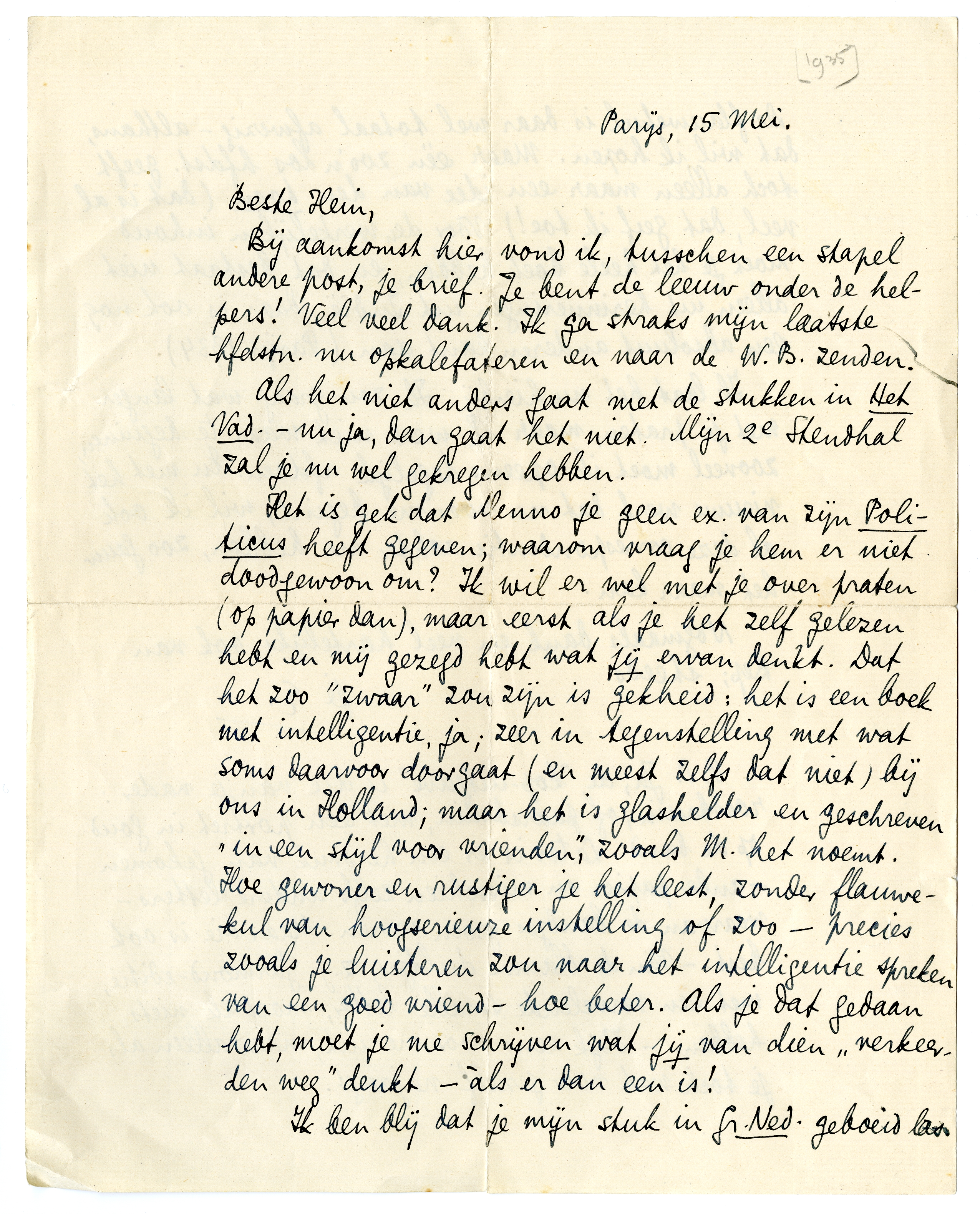 Bij aankomst hier vond ik, tusschen een stapel andere post, je brief. Je bent de leeuw onder de helpers! Veel veel dank. Ik ga straks mijn laatste hfdstn.3197 nu opkalefateren en naar de W.B. zenden.