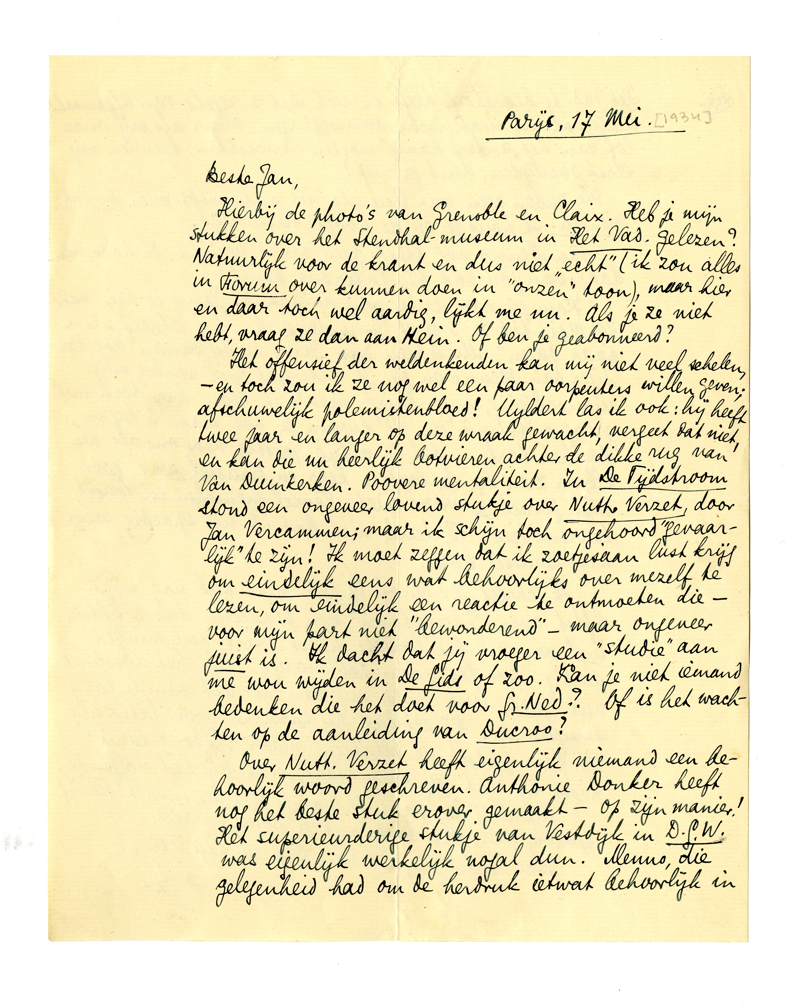 Het offensief der weidenkenden3210 kan mij niet veel schelen, - en toch zou ik ze nog wel een paar oorpeuters willen geven; afschuwelijk polemistenbloed! Uyldert las ik ook: hij heeft twee jaar en langer op deze wraak gewacht, vergeet dat niet, en kan die nu heerlijk botvieren achter de dikke rug van Van Duinkerken. Poovere mentaliteit. In De Tijdstroom stond een ongeveer lovend stukje over Nutt. Verzet, door Jan Vercammen3211; maar ik schijn toch ongehoord ‘gevaarlijk’ te zijn! Ik moet zeggen dat ik zoetjesaan lust krijg om ein-delijk eens wat behoorlijks over mezelf te lezen, om eindelijk een reactie te ontmoeten die - voor mijn part niet ‘bewonderend’ - maar ongeveer juist is. Ik dacht dat jij vroeger een ‘studie’ aan me wou wijden in De Gids of zoo. Kan je niet iemand bedenken die het doet voor Gr.Ned.? Of is het wachten op de aanleiding van Ducroo?