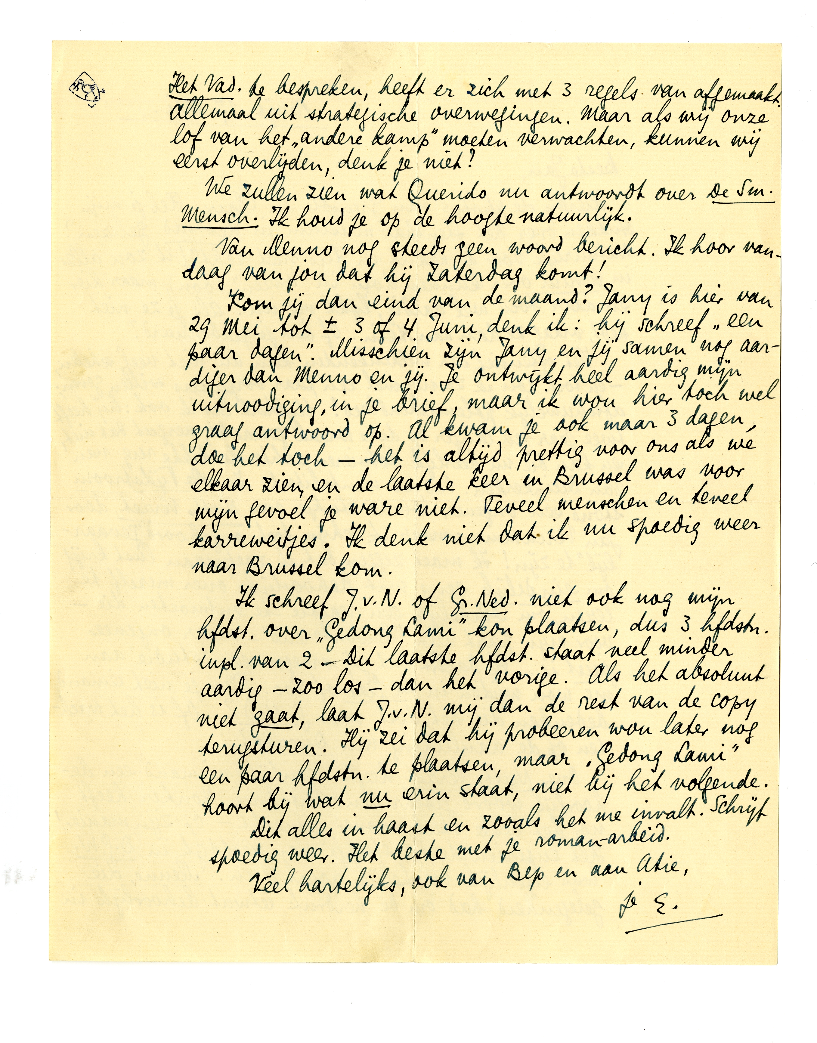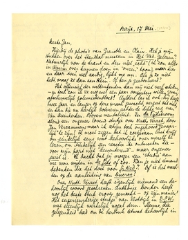 Kom jij dan eind van de maand? Jany is hier van 29 Mei tot ± 3 of 4 Juni, denk ik: hij schreef ‘een paar dagen’. Misschien zijn Jany en jij samen nog aardiger dan Menno en jij. Je ontwijkt heel aardig mijn uitnoodiging, in je brief, maar ik wou hier toch wel graag antwoord op. Al kwam je ook maar 3 dagen, doe het toch - het is altijd prettig voor ons als we elkaar zien, en de laatste keer in Brussel was voor mijn gevoel je ware niet. Teveel menschen en teveel karreweitjes. Ik denk niet dat ik nu spoedig weer naar Brussel kom.