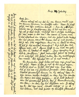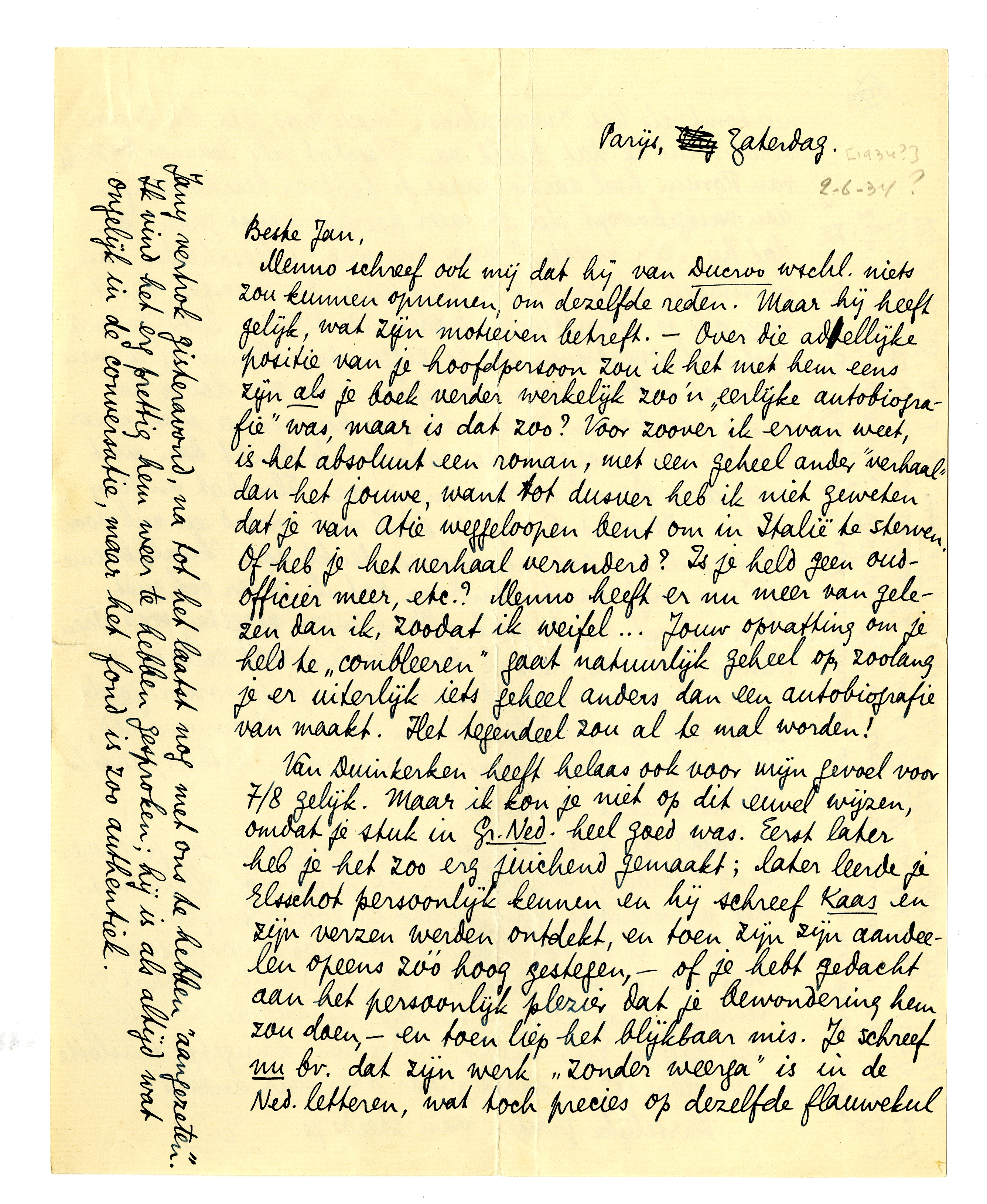 Maar al antwoord ik je nu uitgebreid op je opmerking hierover, erg vind ik de zaak nog allerminst. Het vervelendste vind ik dat er zoo weinig te antwoorden is op het geschrijf van zoo'n rotvent als Van Duinkerken. Je hebt inderdaad over Elsschot geschreven alsof hij een Stendhal of Balzac was, terwijl zijn talent zeer zuiver, maar zijn kringetje tenslotte zeer klein is.* - Later maar over wat anders!