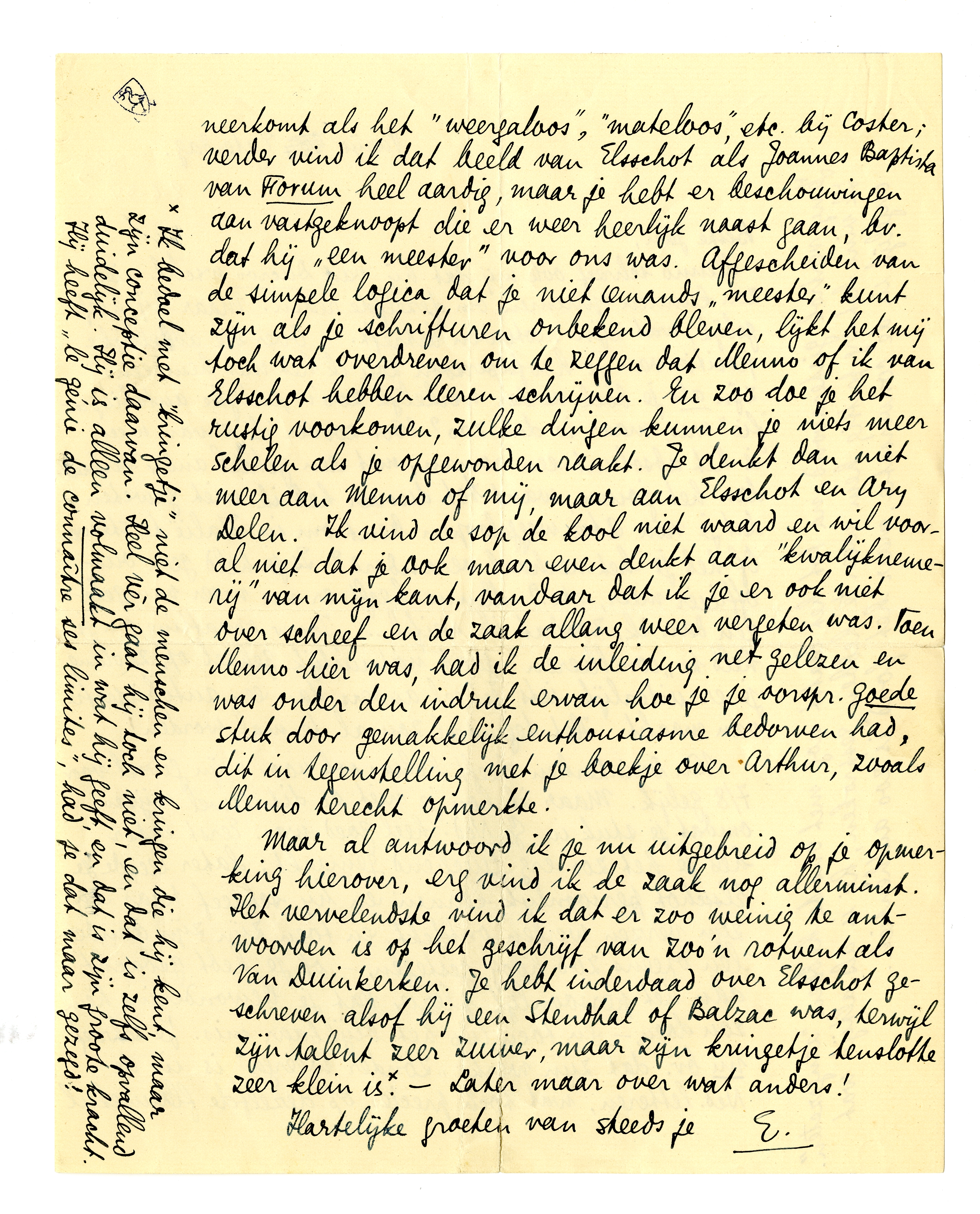 Van Duinkerken heeft helaas ook voor mijn gevoel voor ⅞ gelijk.3238 Maar ik kon je niet op dit euvel wijzen, omdat je stuk in Gr.Ned.3239 heel goed was. Eerst later heb je het zoo erg juichend gemaakt; later leerde je Elsschot persoonlijk kennen en hij schreef Kaas en zijn verzen werden ontdekt, en toen zijn zijn aandeelen opeens zóó hoog gestegen, - of je hebt gedacht aan het persoonlijk plezier dat je bewondering hem zou doen, - en toen liep het blijkbaar mis. Je schreef nu bv. dat zijn werk ‘zonder weerga’ is in de Ned. letteren, wat toch precies op dezelfde flauwekul neerkomt als het ‘weergaloos’, ‘mateloos’, etc. bij Coster; verder vind ik dat beeld van Elsschot als Joannes Baptista van Forum heel aardig, maar je hebt er beschouwingen aan vastgeknoopt die er weer heerlijk naast gaan, bv. dat hij ‘een meester’ voor ons was. Afgescheiden van de simpele logica dat je niet iemands ‘meester’ kunt zijn als je schrifturen onbekend bleven, lijkt het mij toch wat overdreven om te zeggen dat Menno of ik van Elsschot hebben leeren schrijven. En zoo doe je het rustig voorkomen, zulke dingen kunnen je niets meer schelen als je opgewonden raakt. Je denkt dan niet meer aan Menno of mij, maar aan Elsschot en Ary Delen. Ik vind de sop de kool niet waard en wil vooral niet dat je ook maar even denkt aan ‘kwalijknemerij’ van mijn kant, vandaar dat ik je er ook niet over schreef en de zaak allang weer vergeten was. Toen Menno hier was, had ik de inleiding net gelezen en was onder den indruk ervan hoe je je oorspr. goede stuk door gemakkelijk enthousiasme bedorven had, dit in tegenstelling met je boekje over Arthur, zooals Menno terecht opmerkte.