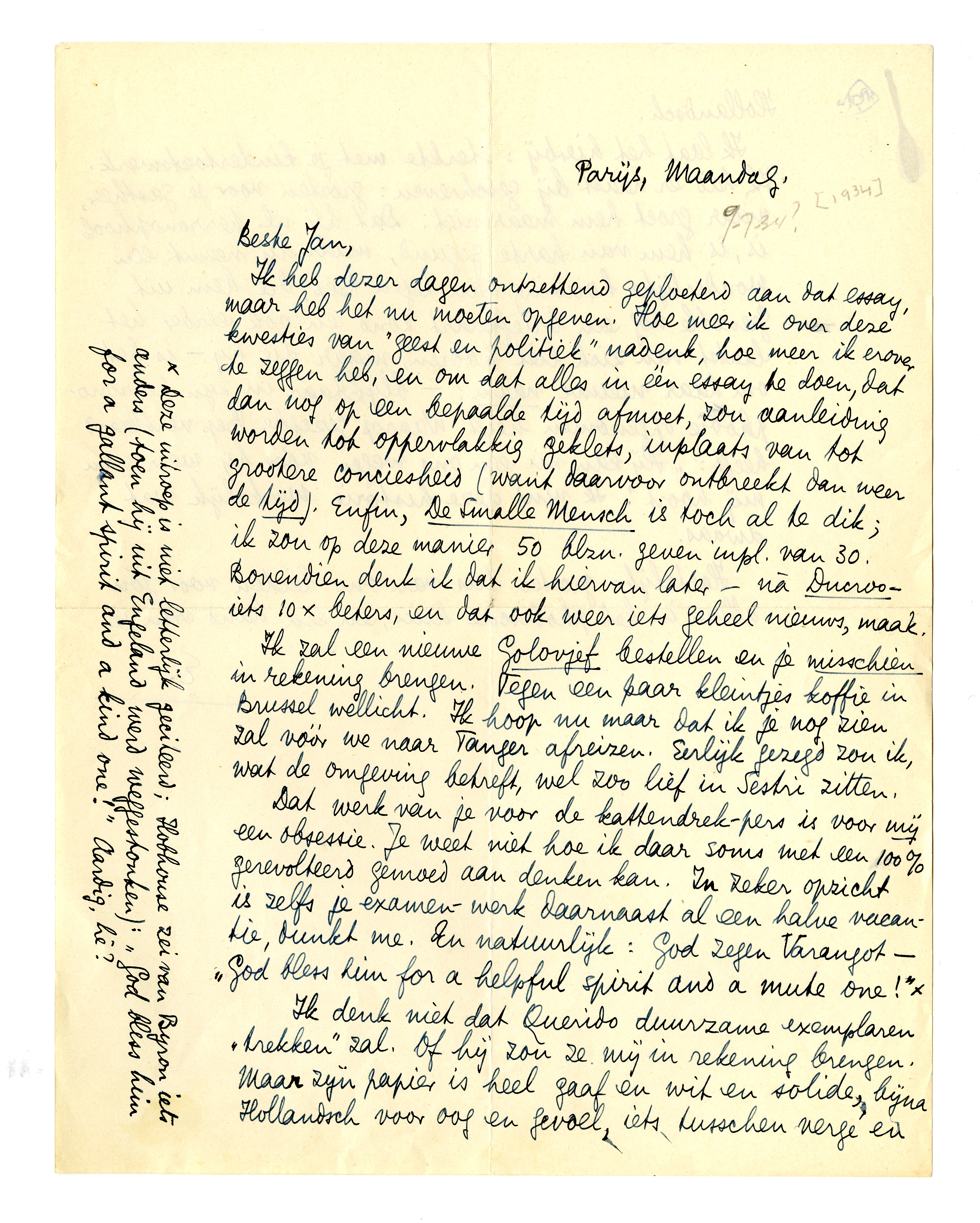 Ik heb dezer dagen ontzettend geploeterd aan dat essay,3250 maar heb het nu moeten opgeven. Hoe meer ik over deze kwesties van ‘geest en politiek’ nadenk, hoe meer ik erover te zeggen heb, en om dat alles in één essay te doen, dat dan nog op een bepaalde tijd afmoet, zou aanleiding worden tot oppervlakkig geklets, inplaats van tot grootere conciesheid (want daarvoor ontbreekt dan weer de tijd). Enfin, De Smalle Mensch is toch al te dik; ik zou op deze manier 50 blzn. geven inpl. van 30. Bovendien denk ik dat ik hiervan later - nà Ducroo - iets 10 × beters, en dat ook weer iets geheel nieuws, maak.