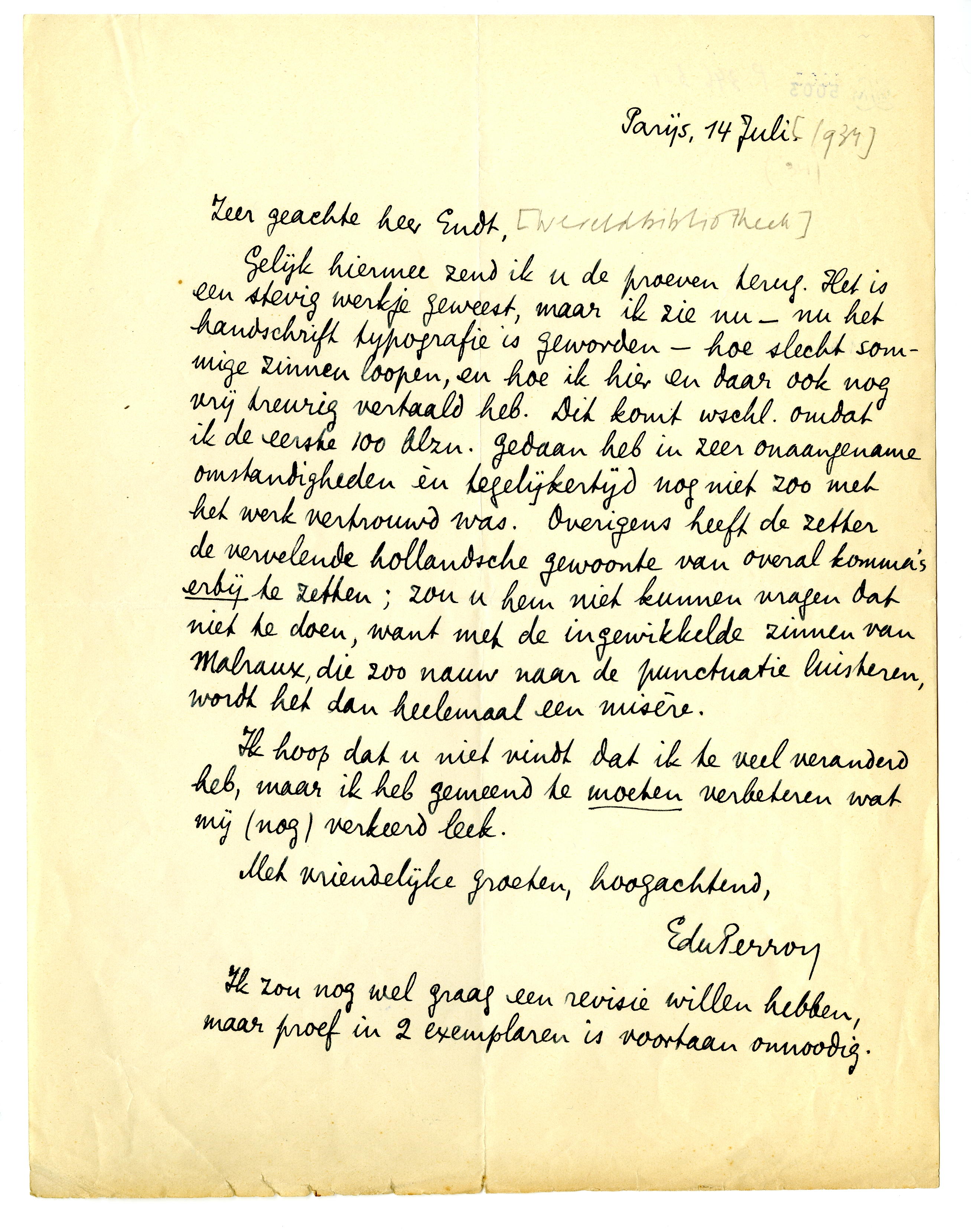 Gelijk hiermee zend ik u de proeven terug. Het is een stevig werkje geweest, maar ik zie nu - nu het handschrift typografie is geworden - hoe slecht sommige zinnen loopen, en hoe ik hier en daar ook nog vrij treurig vertaald heb. Dit komt wschl. omdat ik de eerste 100 blzn. gedaan heb in zeer onaangename omstandigheden èn tegelijkertijd nog niet zoo met het werk vertrouwd was. Overigens heeft de zetter de vervelende hollandsche gewoonte van overal komma's erbij te zetten; zou u hem niet kunnen vragen dat niet te doen, want met de ingewikkelde zinnen van Malraux, die zoo nauw naar de punctuatie luisteren, wordt het dan heelemaal een misère.