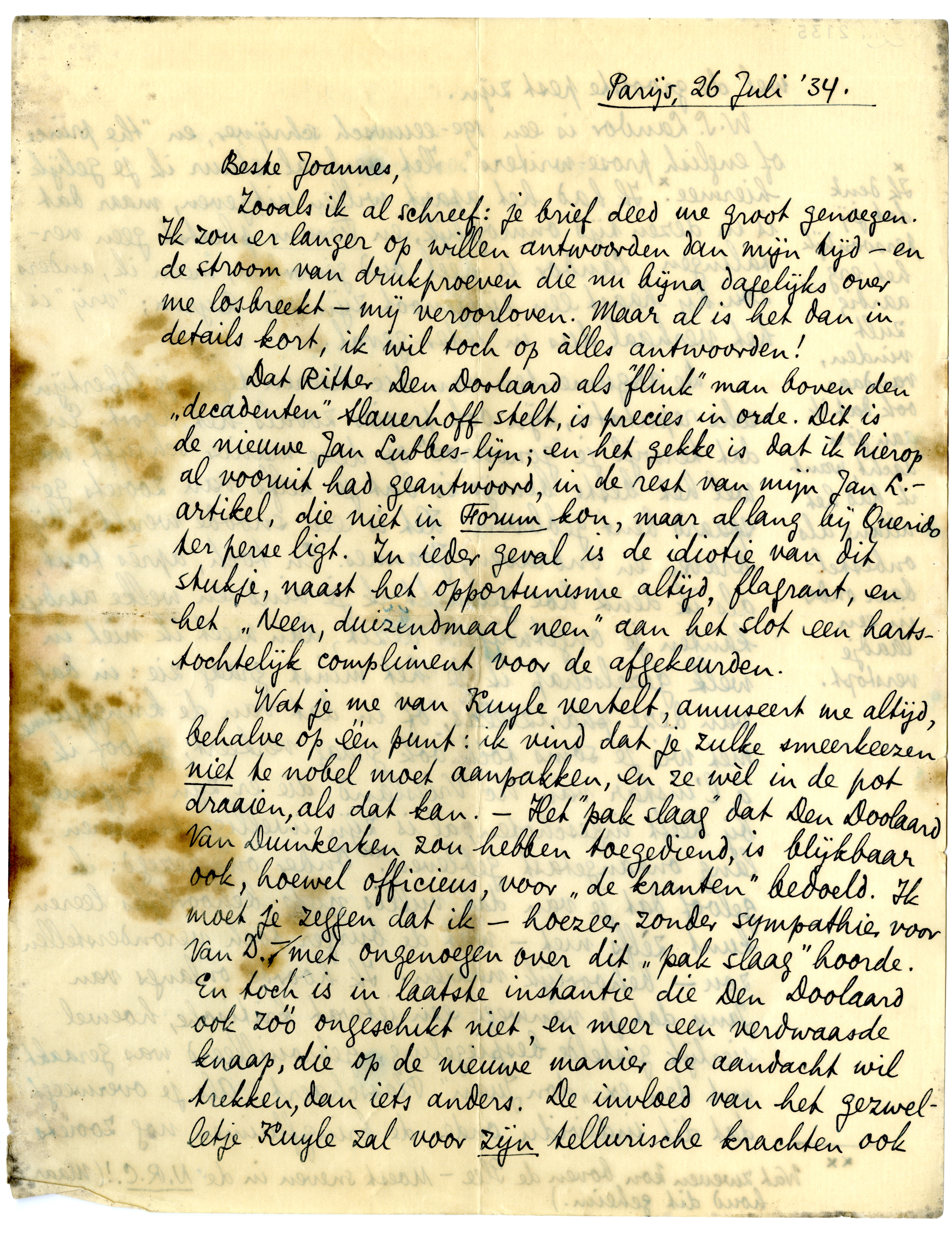 Wat je me van Kuyle vertelt,3293 amuseert me altijd, behalve op één punt: ik vind dat je zulke smeerkeezen niet te nobel moet aanpakken, en ze wèl in de pot draaien, als dat kan. - Het ‘pak slaag’ dat Den Doolaard Van Duinkerken zou hebben toegediend, is blijkbaar ook, hoewel officieus, voor ‘de kranten’ bedoeld. Ik moet je zeggen dat ik - hoezeer zonder sympathie voor Van D. - met ongenoegen over dit ‘pak slaag’ hoorde. En toch is in laatste instantie die Den Doolaard ook zóó ongeschikt niet, en meer een verdwaasde knaap, die op de nieuwe manier de aandacht wil trekken, dan iets anders. De invloed van het gezwelletje Kuyle zal voor zijn tellurische krachten ook wel de grootste pest zijn.