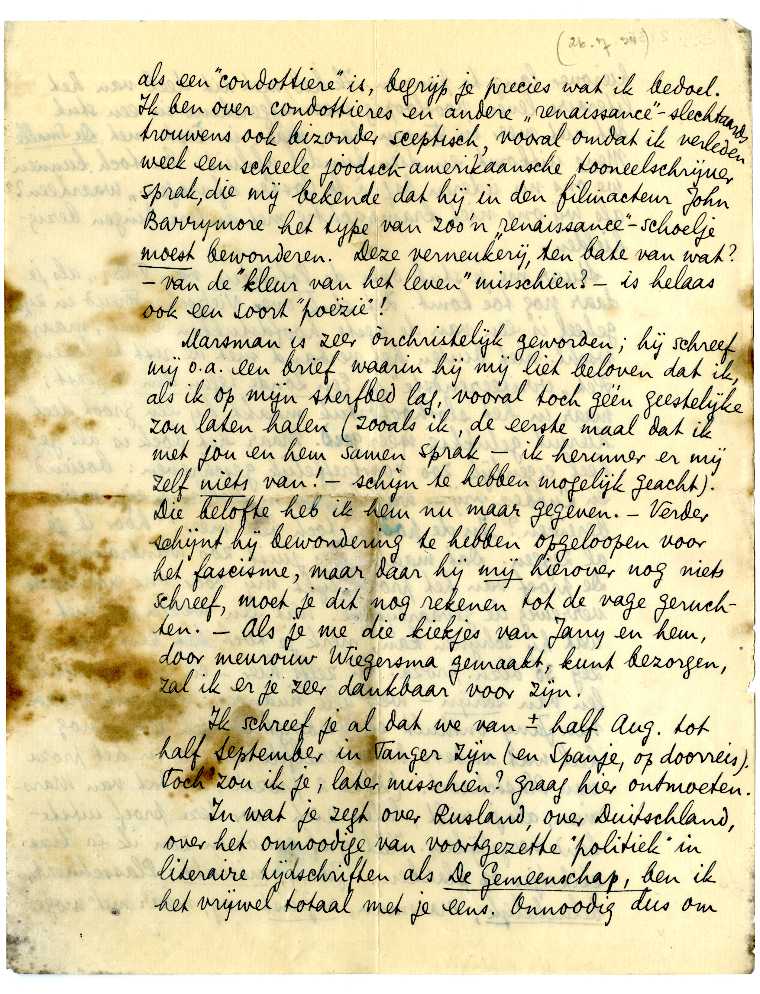 Marsman is zeer ònchristelijk geworden; hij schreef mij o.a. een brief waarin hij mij liet beloven dat ik, als ik op mijn sterfbed lag, vooral toch géén geestelijke zou laten halen (zooals ik, de eerste maal dat ik met jou en hem sprak - ik herinner er mij zelf niets van! - schijn te hebben mogelijk geacht). Die belofte heb ik hem nu maar gegeven. - Verder schijnt hij bewondering te hebben opgeloopen voor het fascisme, maar daar hij mij hierover nog niets schreef, moet je dit nog rekenen tot de vage geruchten. - Als je me die kiekjes van Jany en hem, door mevrouw Wiegersma gemaakt, kunt bezorgen, zal ik er je zeer dankbaar voor zijn.