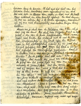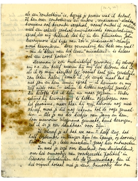 P.S. - Ik zag laatst in De Groene dat graphologenstukje over onze hss.3300 Als het geen grap is, is het hier en daar heel aardig. Maar wat een verschil tusschen 's mans termen als hij het over jou, Binnendijk en Buning heeft, of over mij of Vestdijk bijv.! Ik ben geneigd te gelooven dat de poëzie ook zoo'n grapholoog meer ‘lyrisch’ maakt dan ‘lucide’. Maar wat hij over Jany schreef was, met uitzondering van 2 punten, uitstekend. Hoe jammer dat het handje van Slauerhoff ontbrak! Hoeveel ‘masochisme’ dààrin? - Deze deskundigen zijn wonderlijk, ook als ze de sterren raadplegen: ik ben geboren onder een kruising van Mars en de Schorpioen - wordt het niet haast àl te mooi en is het niet of ze onder elkaar complotteeren?!
