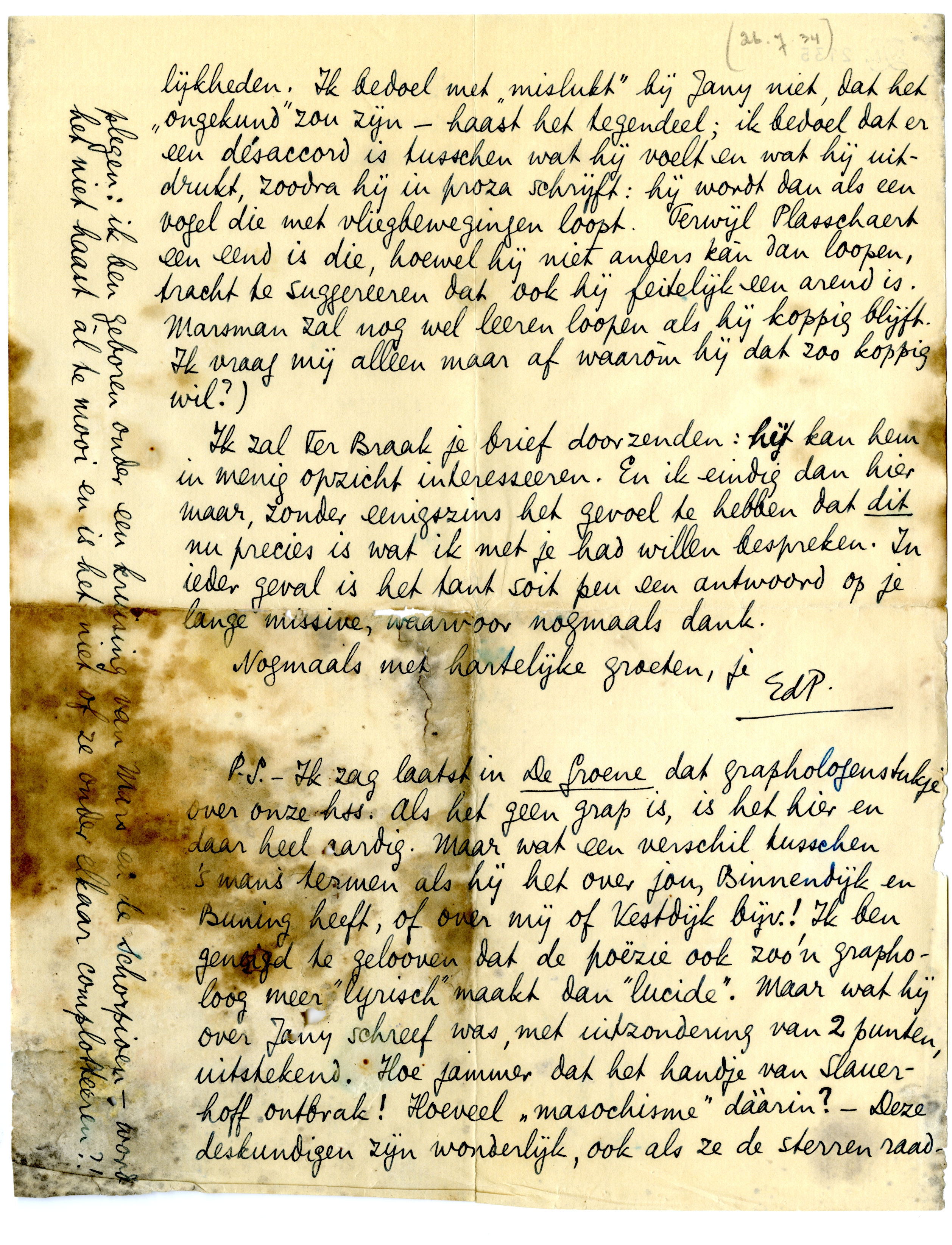 Ik zal Ter Braak je brief doorzenden: hij kan hem in menig opzicht interesseeren. En ik eindig dan hier maar, zonder eenigszins het gevoel te hebben dat dit nu precies is wat ik met je had willen bespreken. In ieder geval is het tant soit peu een antwoord op je lange missive, waarvoor nogmaals dank.