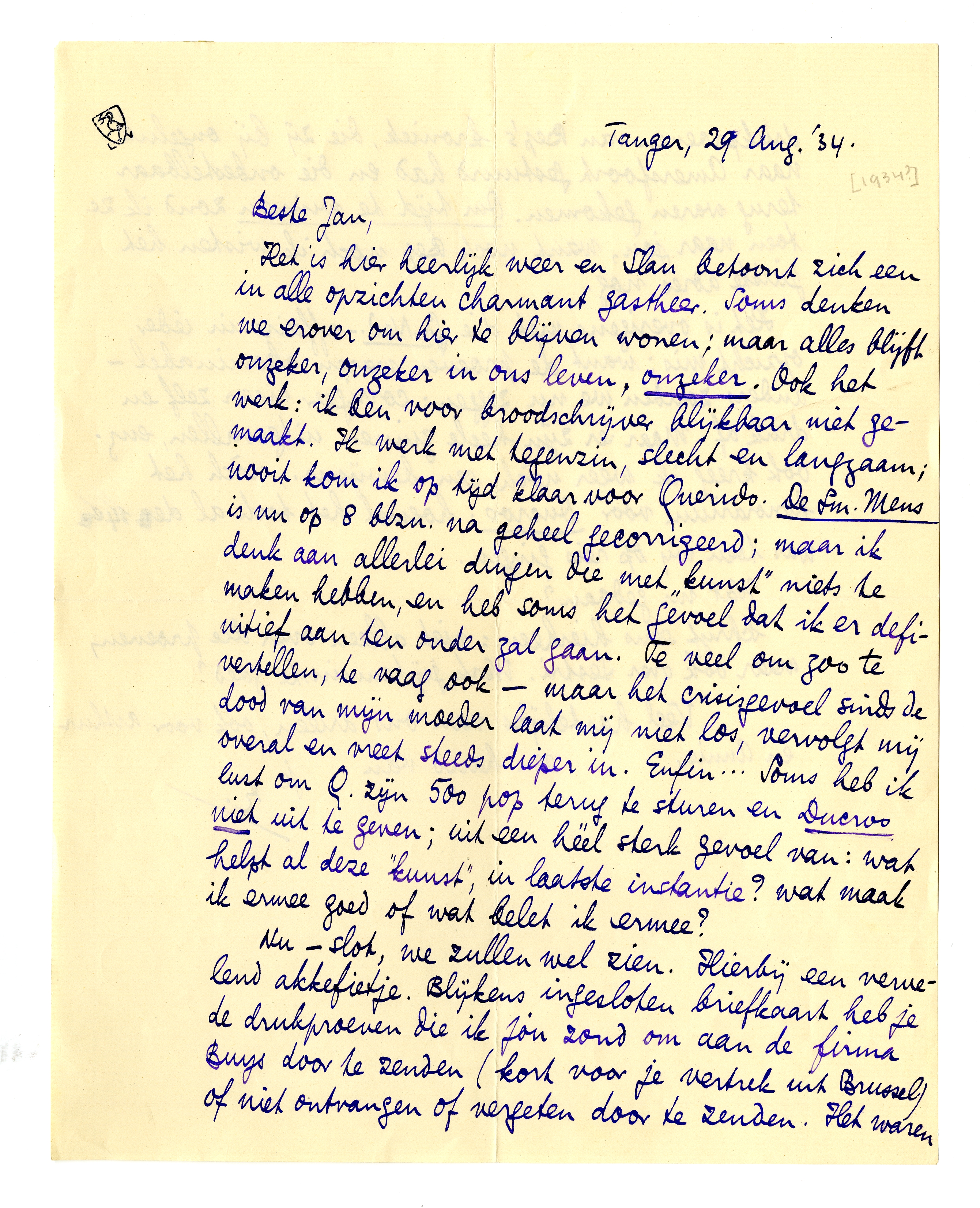 Het is hier heerlijk weer en Slau betoont zich een in alle opzichten charmant gastheer. Soms denken we erover om hier te blijven wonen, maar alles blijft onzeker, onzeker in ons leven, onzeker. Ook het werk: ik ben voor broodschrijver blijkbaar niet gemaakt. Ik werk met tegenzin, slecht en langzaam; nooit kom ik op tijd klaar voor Querido. De Sm. Mens is nu op 8 blzn. na geheel gecorrigeerd; maar ik denk aan allerlei dingen die met ‘kunst’ niets te maken hebben, en heb soms het gevoel dat ik er definitief aan ten onder zal gaan. Te veel om zoo te vertellen, te vaag ook - maar het crisisgevoel sinds de dood van mijn moeder laat mij niet los, vervolgt mij overal en vreet steeds dieper in. Enfin... Soms heb ik lust om Q. zijn 500 pop terug te sturen en Ducroo niet uit te geven; uit een héél sterk gevoel van: wat helpt al deze ‘kunst’, in laatste instantie? wat maak ik ermee goed of wat belet ik ermee?