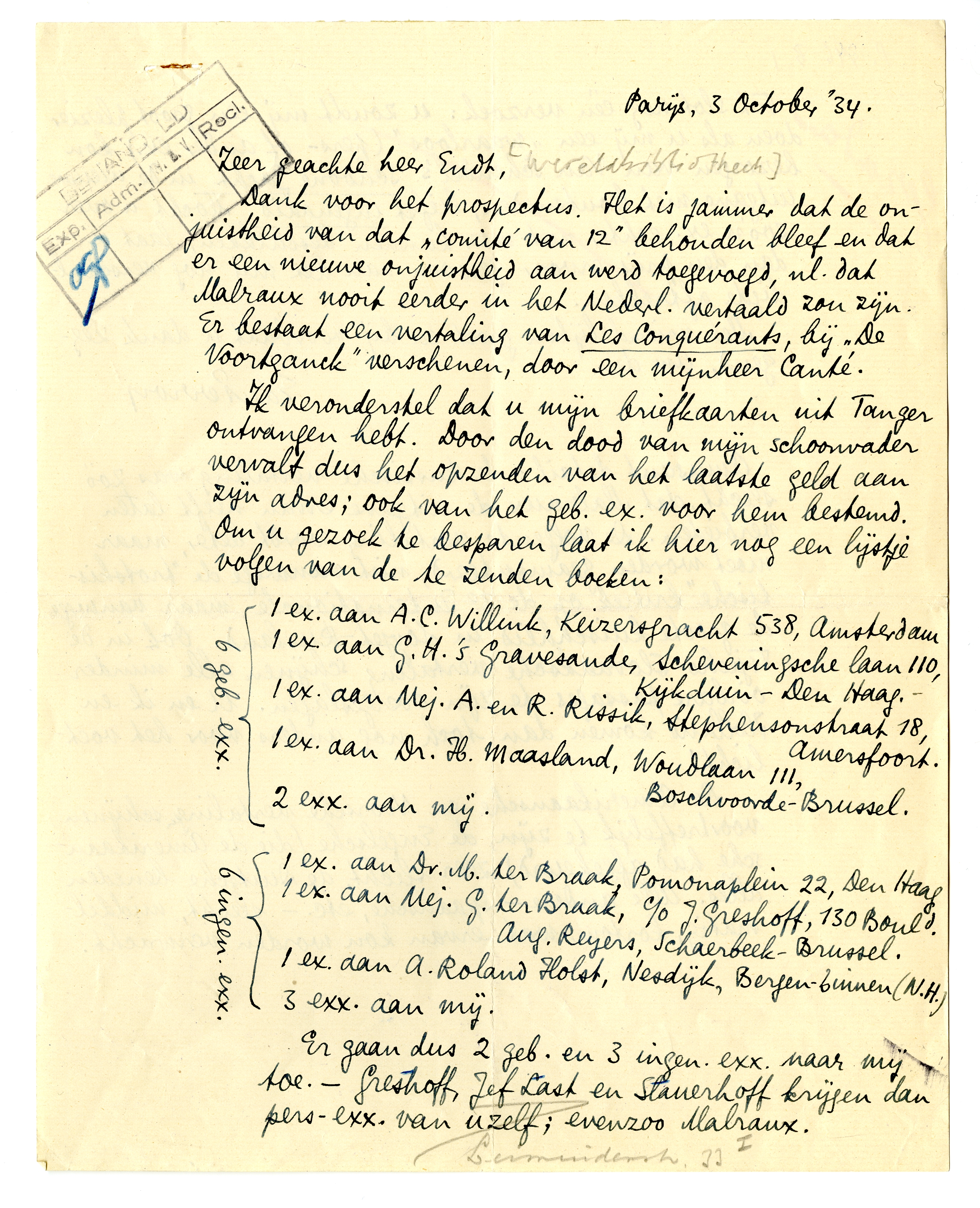 Er gaan dus 2 geb. en 3 ingen. exx. naar mij toe. - Greshoff, Jef Last en Slauerhoff krijgen dan pers-exx. van uzelf; evenzoo Malraux.