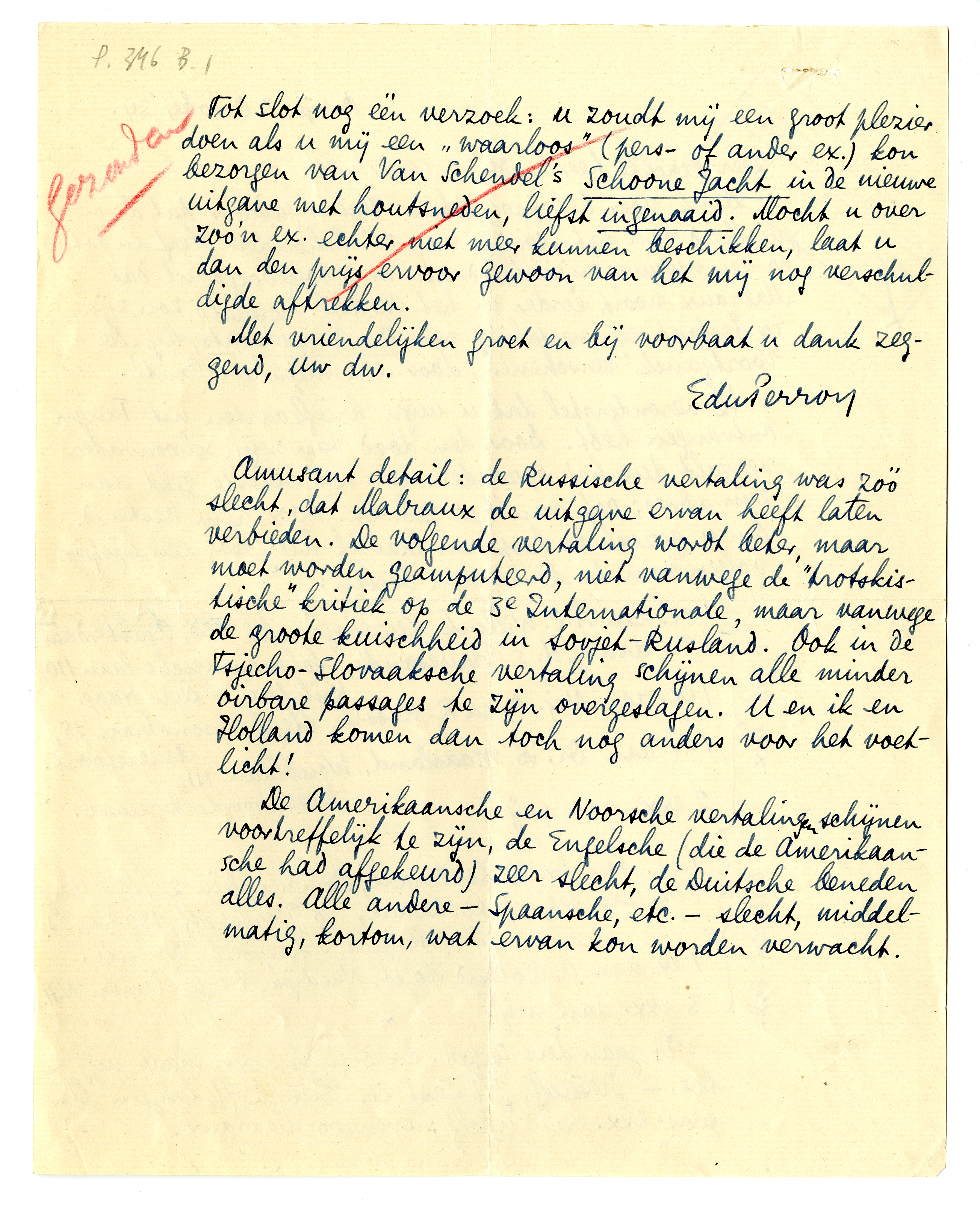 Amusant detail: de Russische vertaling was zóó slecht, dat Malraux de uitgave ervan heeft laten verbieden. De volgende vertaling wordt beter, maar moet worden geamputeerd, niet vanwege de ‘trotskistische’ kritiek op de 3e Internationale, maar vanwege de groote kuischheid in Sovjet-Rusland. Ook in de Tsjecho-Slovaaksche vertaling schijnen alle minder oirbare passages te zijn overgeslagen. U en ik en Holland komen dan toch nog anders voor het voetlicht!