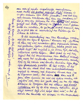 Is die veroordeeling van Van Ravesteyn3368 overigens niet iets om tegen te ageeren? Kunnen wij - jij, Menno, ik, Slau, nog wat menschen - geen organisatie vormen met protesten, lijsten, artikelen, zoodra zooiets weer plaats heeft? Het ongeluk is, in dezen tijd, dat alleen collectieve acties helpen. Last sprak er mij over, zeggend dat het communisme voor Holland verdacht was, maar dat verbonden niet-communisten misschien toch op die manier wat konden bereiken tegen dergelijke fascistische procédés. Ik had vroeger al het idee om een soort club voor individualistische vrijheid te vormen, met Kramers, Menno, enz. (na de Liepmann-zaak). Dat scheen toen niet te gaan. Maar kunnen we niet iets beters vinden, iets ‘wijders’ ook, voor het goede doel, en om die staatskoetsiers te bewijzen dat wij althans met kracht protesteeren als zij op deze manier optreden. Als je altijd vooruit zegt ‘het helpt toch niet’, is dat de manier om tenslotte als schapen in een concentratiekamp te komen. Op Urk, zegt men!