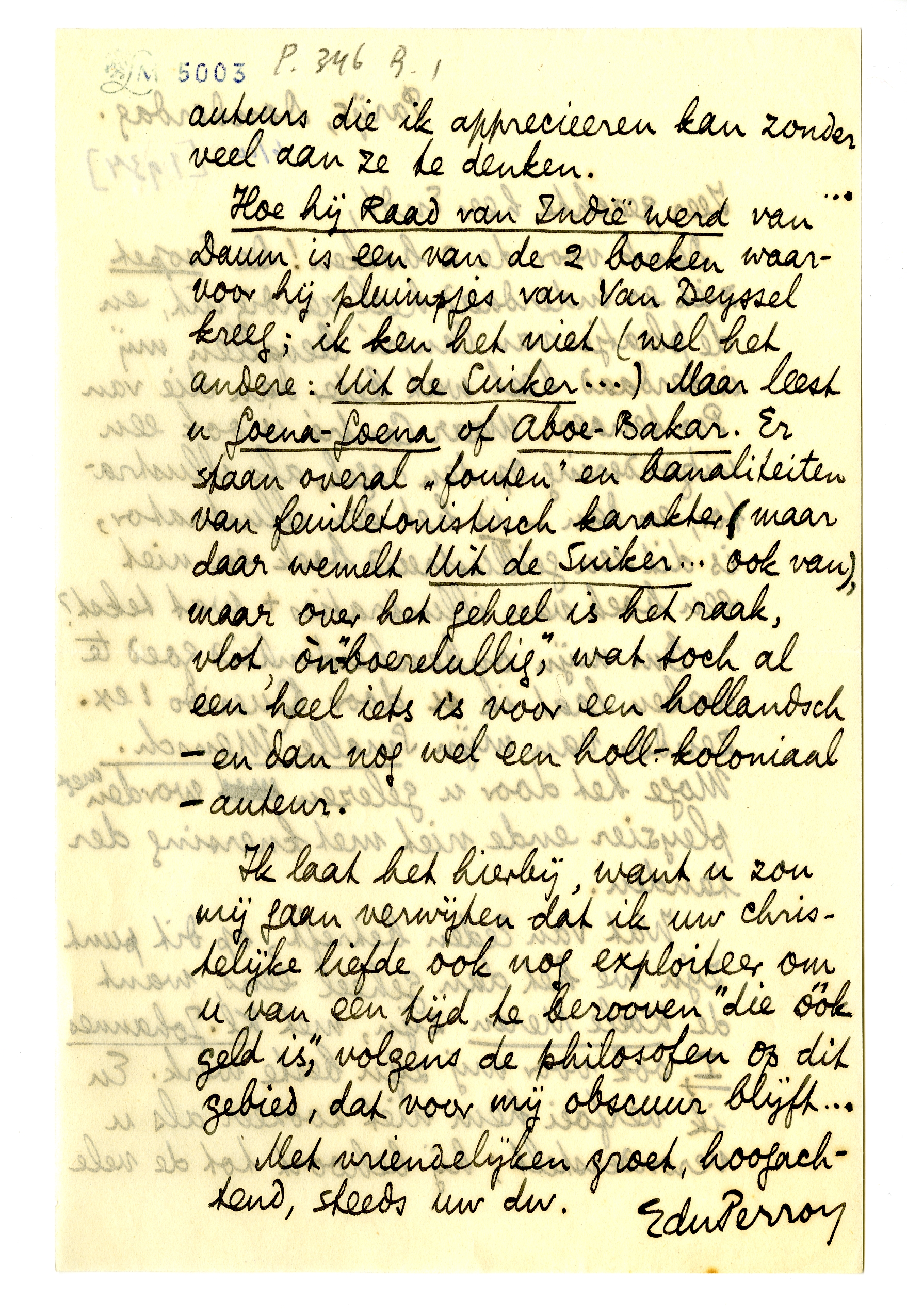 Hoe hij Raad van Indië werd van Daum is een van de 2 boeken waarvoor hij pluimpjes van Van Deyssel kreeg; ik ken het niet (wel het andere: Uit de Suiker...) Maar leest u Goena-Goena of Aboe-Bakar. Er staan overal ‘fouten’ en banaliteiten van feuilletonistisch karakter (maar daar wemelt Uit de Suiker... ook van), maar over het geheel is het raak, vlot, òn-‘boerelullig’, wat toch al een heel iets is voor een hollandsch - en dan nog wel een holl.-koloniaal - auteur.