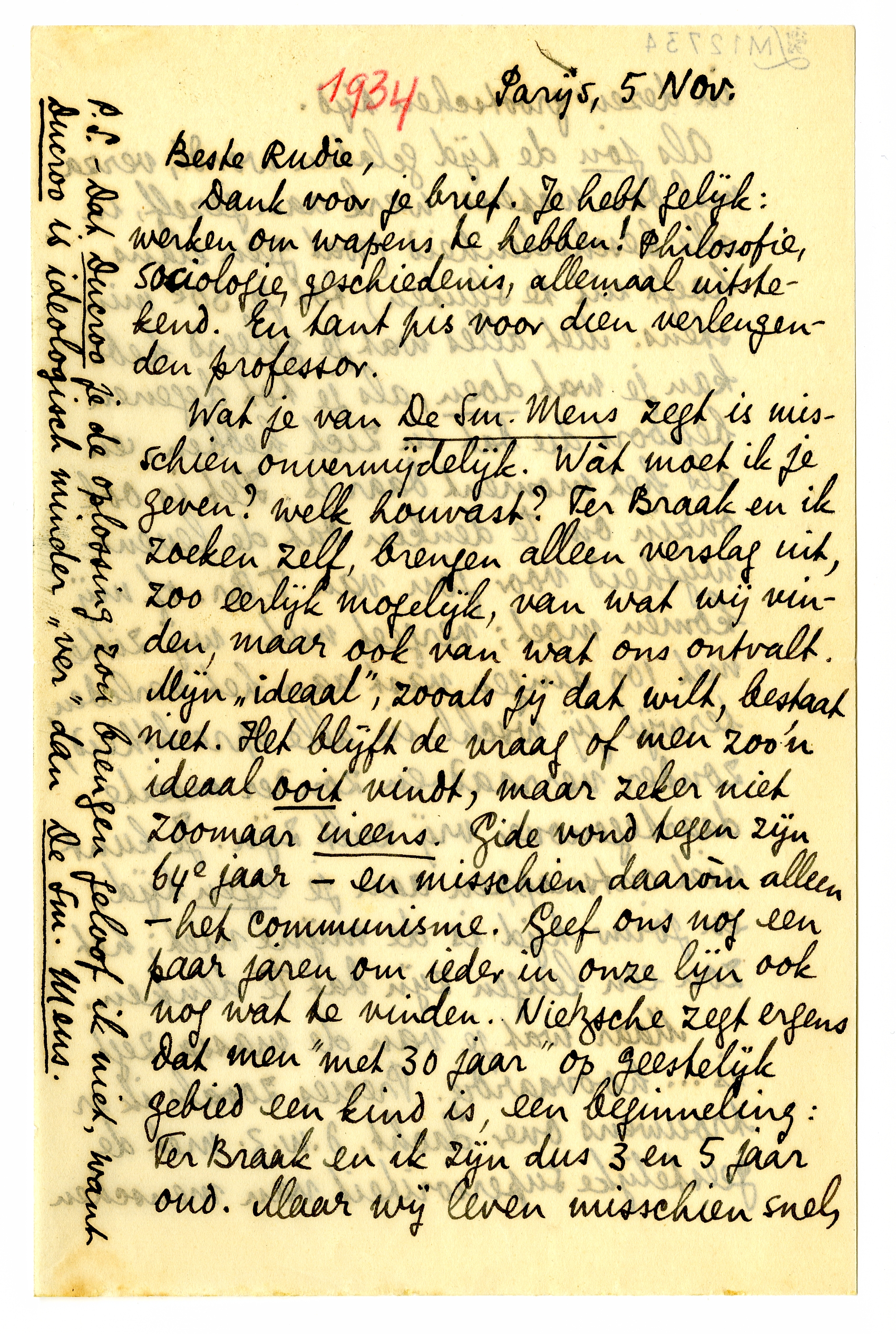 Wat je van De Sm. Mens zegt is misschien onvermijdelijk. Wàt moet ik je geven? welk houvast? Ter Braak en ik zoeken zelf, brengen alleen verslag uit, zoo eerlijk mogelijk, van wat wij vinden, maar ook van wat ons ontvalt. Mijn ‘ideaal’, zoals jij dat wilt, bestaat niet. Het blijft de vraag of men zoo'n ideaal ooit vindt, maar zeker niet zoomaar ineens. Gide vond tegen zijn 64e jaar - en misschien daaròm alleen - het communisme. Geef ons nog een paar jaren om ieder in onze lijn ook nog wat te vinden. Nietzsche zegt ergens dat men ‘met 30 jaar’ op geestelijk gebied een kind is, een beginneling: Ter Braak en ik zijn dus 3 en 5 jaar oud. Maar wij leven misschien snel, in dezen grootschen tijd.