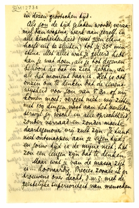 Als jou de tijd gelaten wordt, verzamel dan wapens, werk aan jezelf, in alle bescheidenheid (wat geen élans hoeft uit te sluiten) tot je 30e minstens. Met alles wat je geleerd hebt kan je wat doen, als je tot degenen behoort die dat in zich hebben, en als het moment daar is. Het is ook onzin om te denken dat de levenswijsheid voor jou van T. Br. of mij komen moet; vergeet nièt: wij zitten met 100 dingen vast aan het verleden, terwijl jij wschl. in alle oprechtheid, zonder verraad en zonder moeite, daartegenover vrij zult zijn. Je kunt niet ontsnappen aan je eigen tijd; en jouw tijd is de mijne niet; het zou een leugen zijn dat te denken.