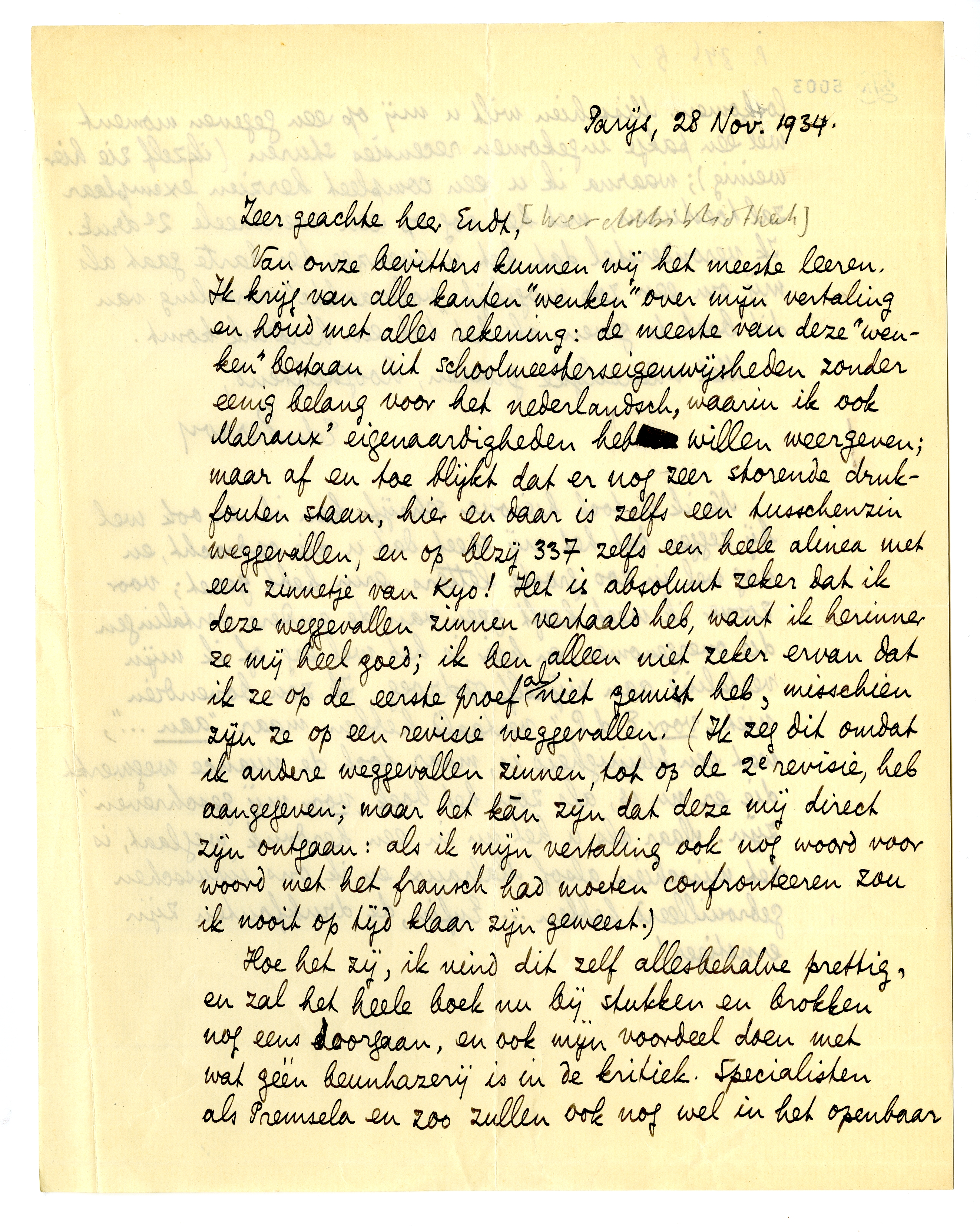 Nu ik u toch hierover schrijf, kan ik er ook wel bij zeggen dat het mij speet dat u die opdracht, en nog wel in zoo groote letters, erin hebt gezet; voor zoover ik weet heeft geen van de andere vertalingen die overgenomen, en hier is het wel erg of ik mijn vertaling aan mijzelf opdroeg. Ik zou bovendien niet ‘voor E. d P.’ vertaald hebben, maar ‘aan...’, wat een kleinigheid is, maar toch de nuance wegwerkt die er nu is, als zou het boek ‘voor mij geschreven’ zijn. Maar als u het nu in een herdruk weglaat, is het misschien alsof Malraux en ik ons intusschen gebrouilleerd hebben... Enfin, de drukfouten zijn ernstiger!