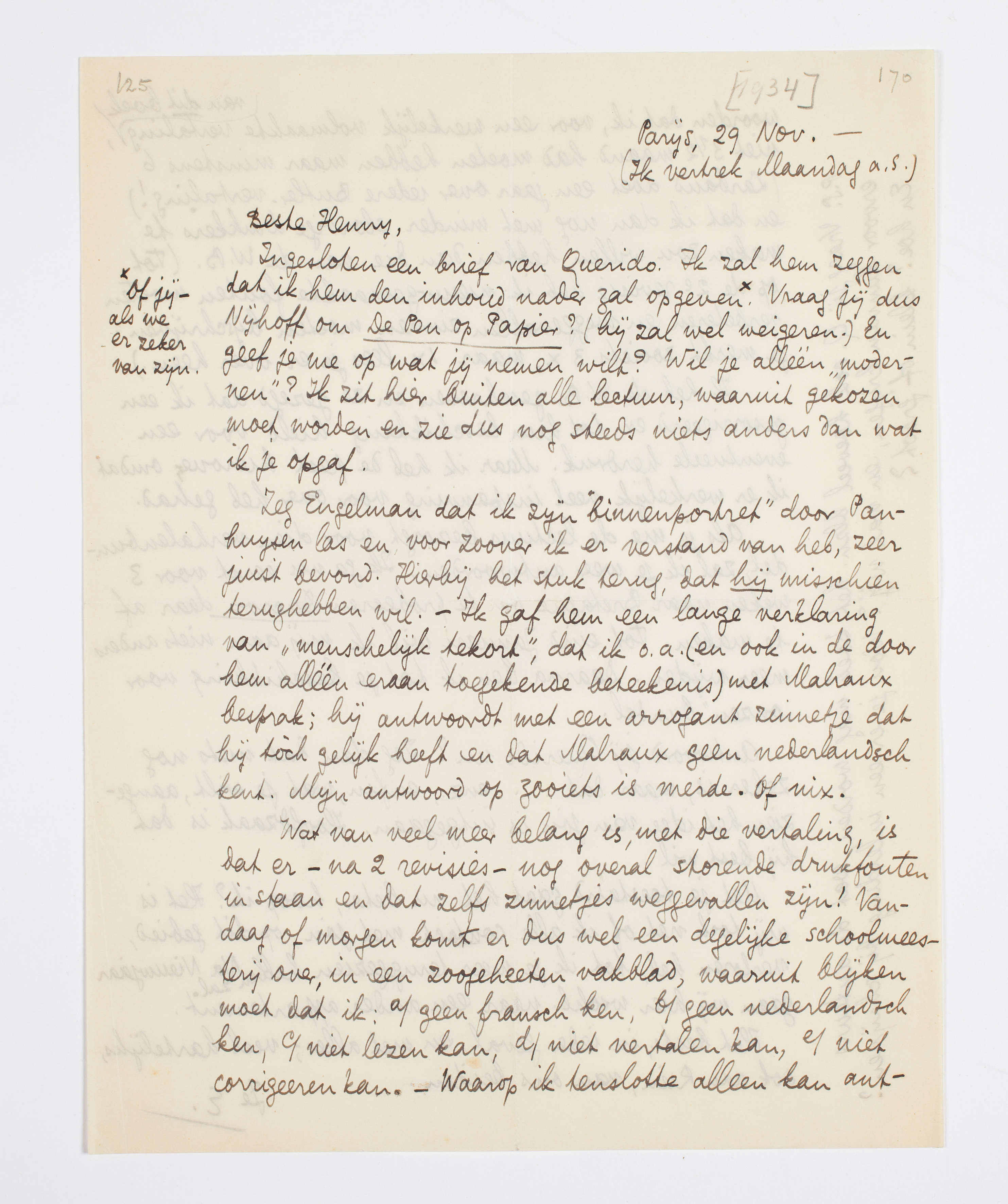 Zeg Engelman dat ik zijn ‘binnenportret’ door Panhuysen3464 las en, voor zoover ik er verstand van heb, zeer juist bevond. Hierbij het stuk terug, dat hij misschien terughebben wil. - Ik gaf hem een lange verklaring van ‘menschelijk tekort’, dat ik o.a. (en ook in de door hem alléén eraan toegekende beteekenis) met Malraux besprak; hij antwoordt met een arrogant zinnetje dat hij tòch gelijk heeft en dat Malraux geen nederlandsch kent. Mijn antwoord op zooiets is merde. Of nix.