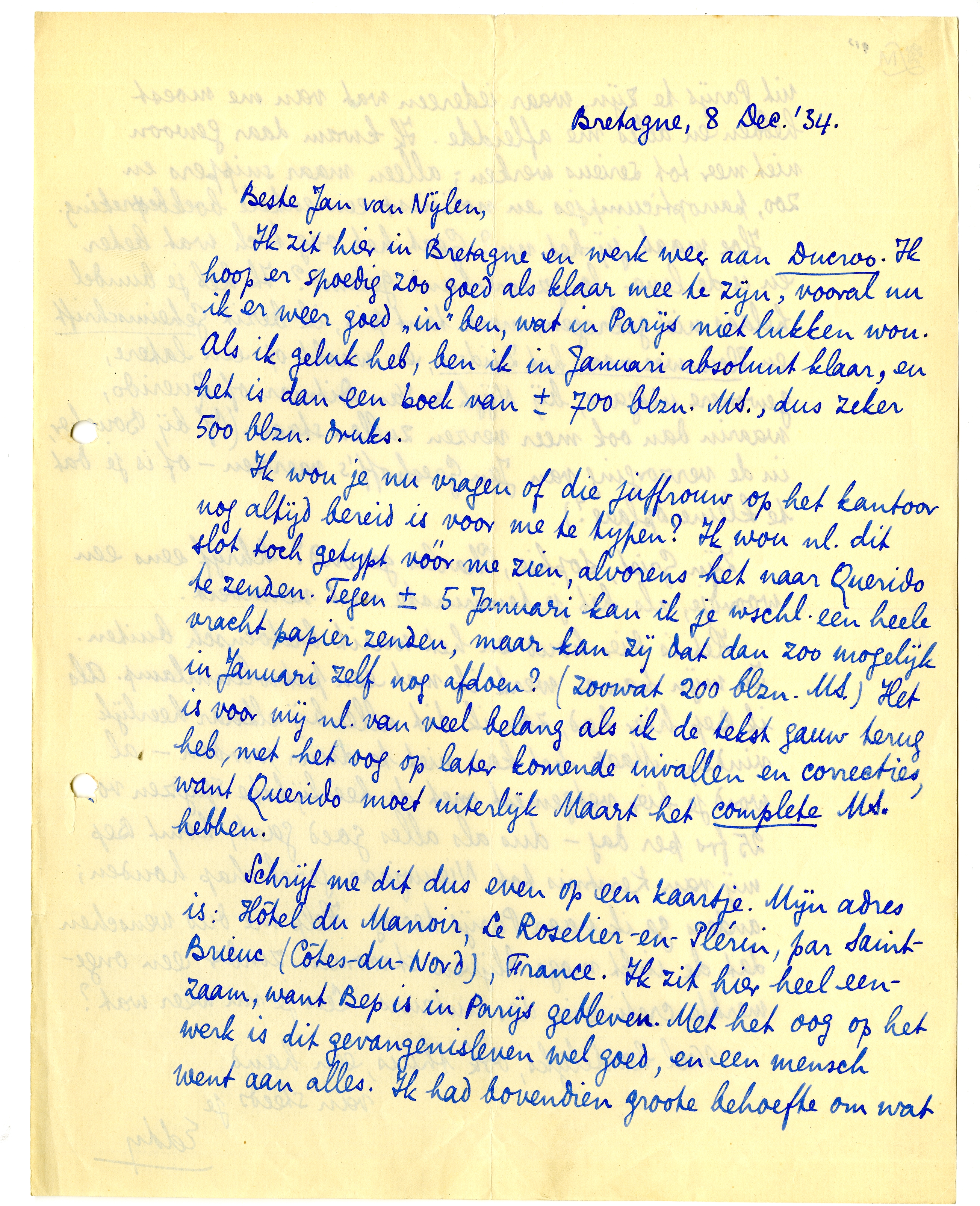 Ik wou je nu vragen of die juffrouw op het kantoor nog altijd bereid is voor me te typen? Ik wou nl. dit slot toch getypt vóór me zien, alvorens het naar Querido te zenden. Tegen ± 5 Januari kan ik je wschl. een heele vracht papier zenden, maar kan zij dat dan zoo mogelijk in Januari zelf nog afdoen? (zoowat 200 blzn. MS.) Het is voor mij nl. van veel belang als ik de tekst gauw terug heb, met het oog op later komende invallen en correcties, want Querido moet uiterlijk Maart het complete MS. hebben.
