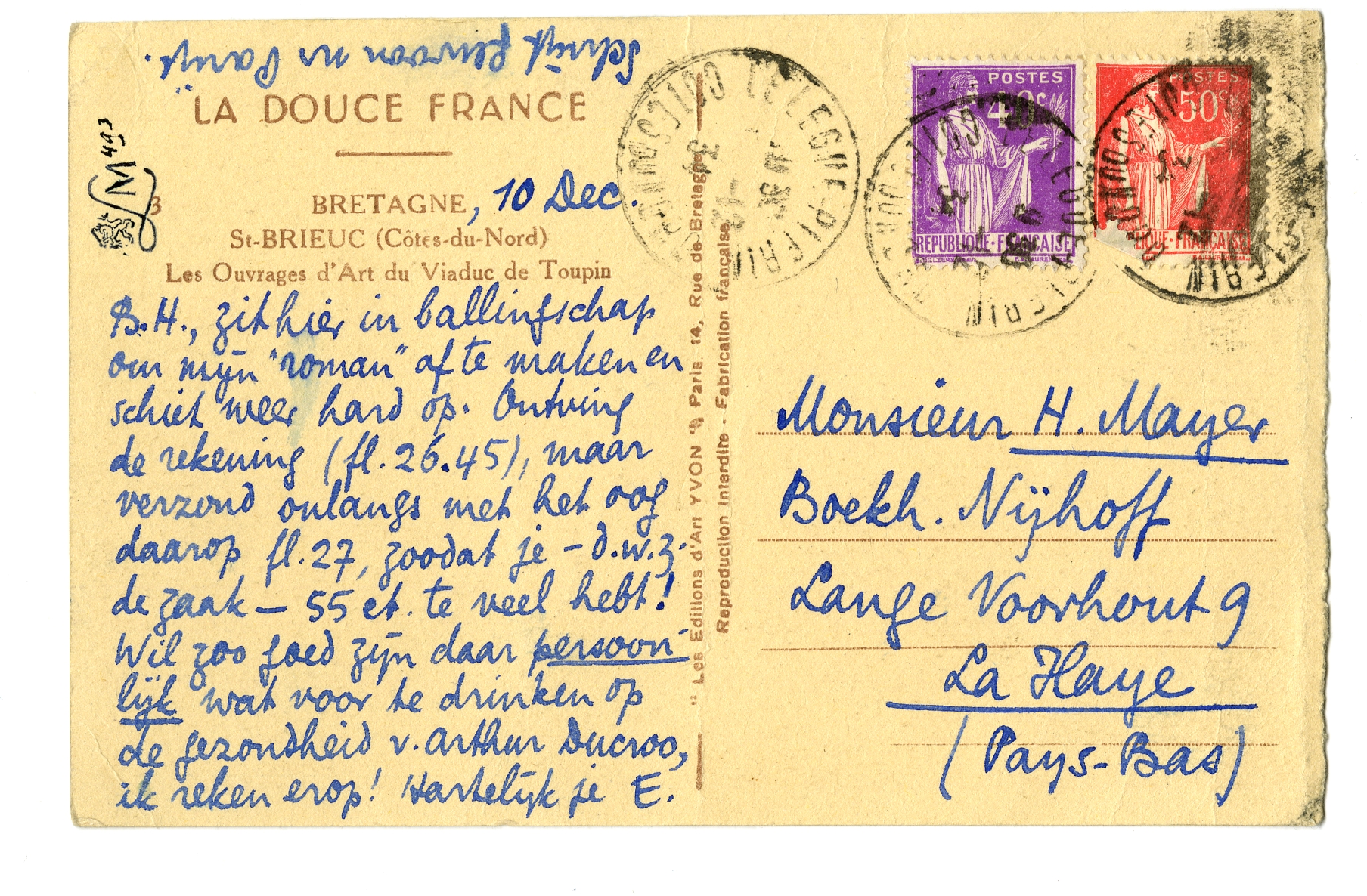B.H., zit hier in ballingschap om mijn ‘roman’ af te maken en schiet weer hard op. Ontving de rekening (fl.26.45), maar verzond onlangs met het oog daarop fl.27, zoodat je - d.w.z. de zaak - 55 ct. te veel hebt! Wil zoo goed zijn daar persoonlijk wat voor te drinken op de gezondheid v. Arthur Ducroo, ik reken erop! Hartelijk je
