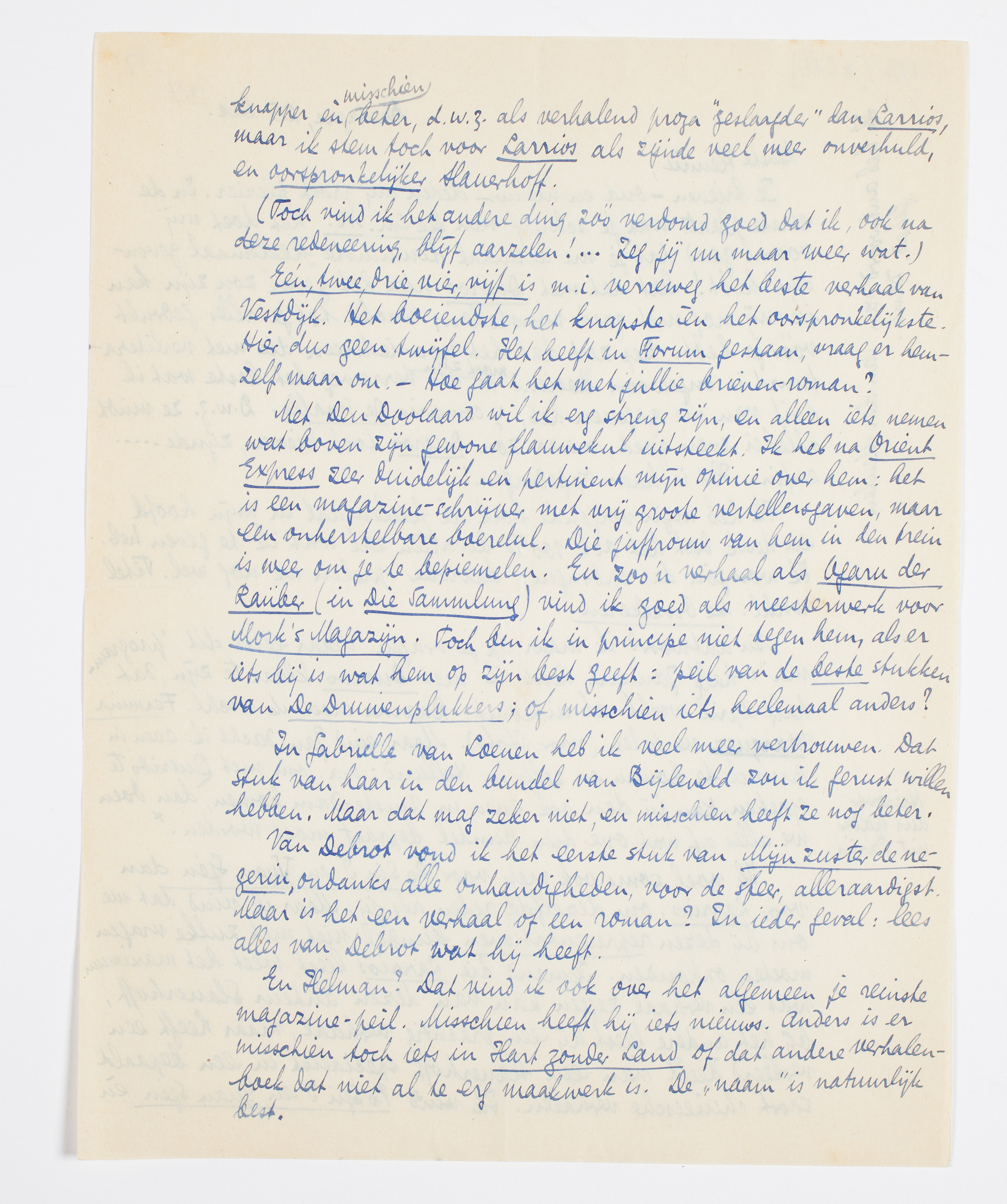 Ik voel soms ook meer voor Po Sju I en Yuan Sjen dan voor Larrios, om dezelfde reden als jij. Maar ik vind dat we ons bij dezen representatieven bundel niet met zulke vragen moeten ophouden. Iemand die Larrios leest, weet het maximum wat één verhaal zeggen kan van dezen auteur Slauerhoff, bij het andere leest hij een prachtig verhaal, maar heeft een verkeerd beeld van een Slauerhoff, specialist in een bepaald soort chineesche verhalen. Ik vind Po Sju I en Yuan Sjen èn knapper èn misschien beter, d.w.z. als verhalend proza ‘geslaagder’ dan Larrios, maar ik stem toch voor Larrios als zijnde veel meer onverhuld, en oorspronkelijker Slauerhoff.