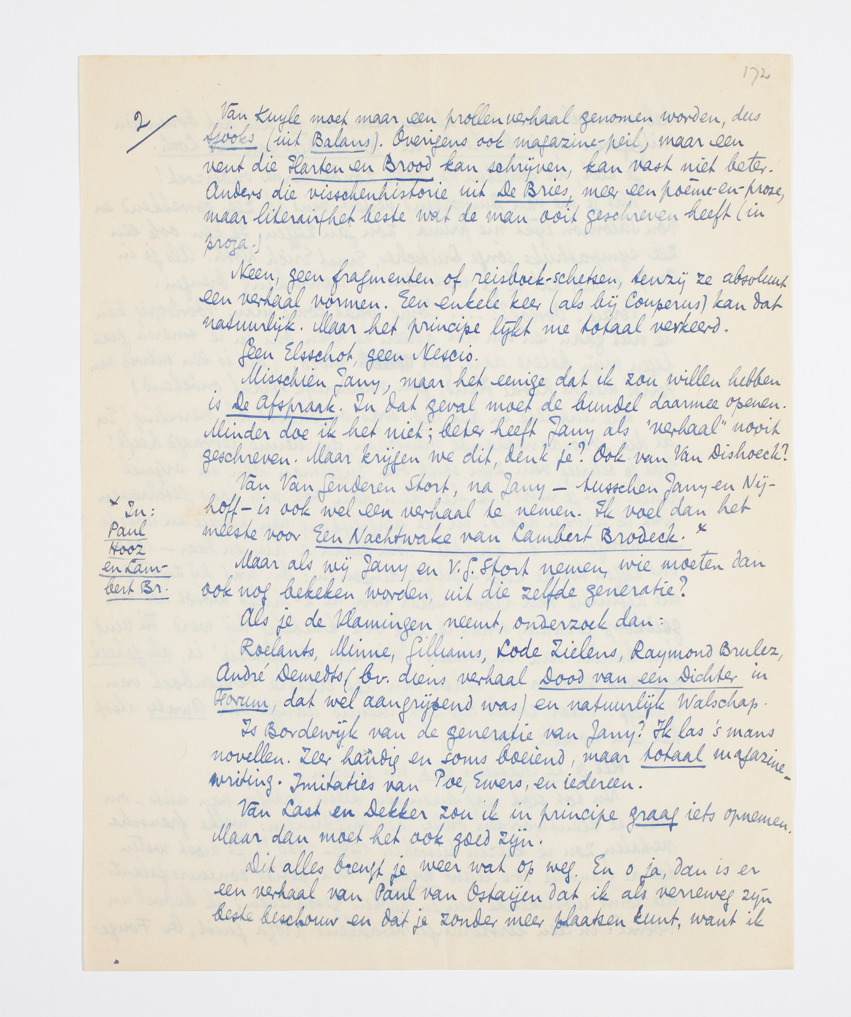 Nu antwoord ik maar op je vragen. Maar eerst dit ‘programma’; half Januari denk ik met Ducroo klaar te zijn, dat half April wschl. al uitkomt. Daarna moet ik wschl. Fermina Marquez vertalen (voor Stols). Maar eind Jan. dacht ik even in Brussel te komen en zelfs in Holland; o.a. om met Querido te spreken. Kan jij dan ook even in Amsterdam komen, dan doen we alles af wat over dien bundel bepraat moet worden.*3494