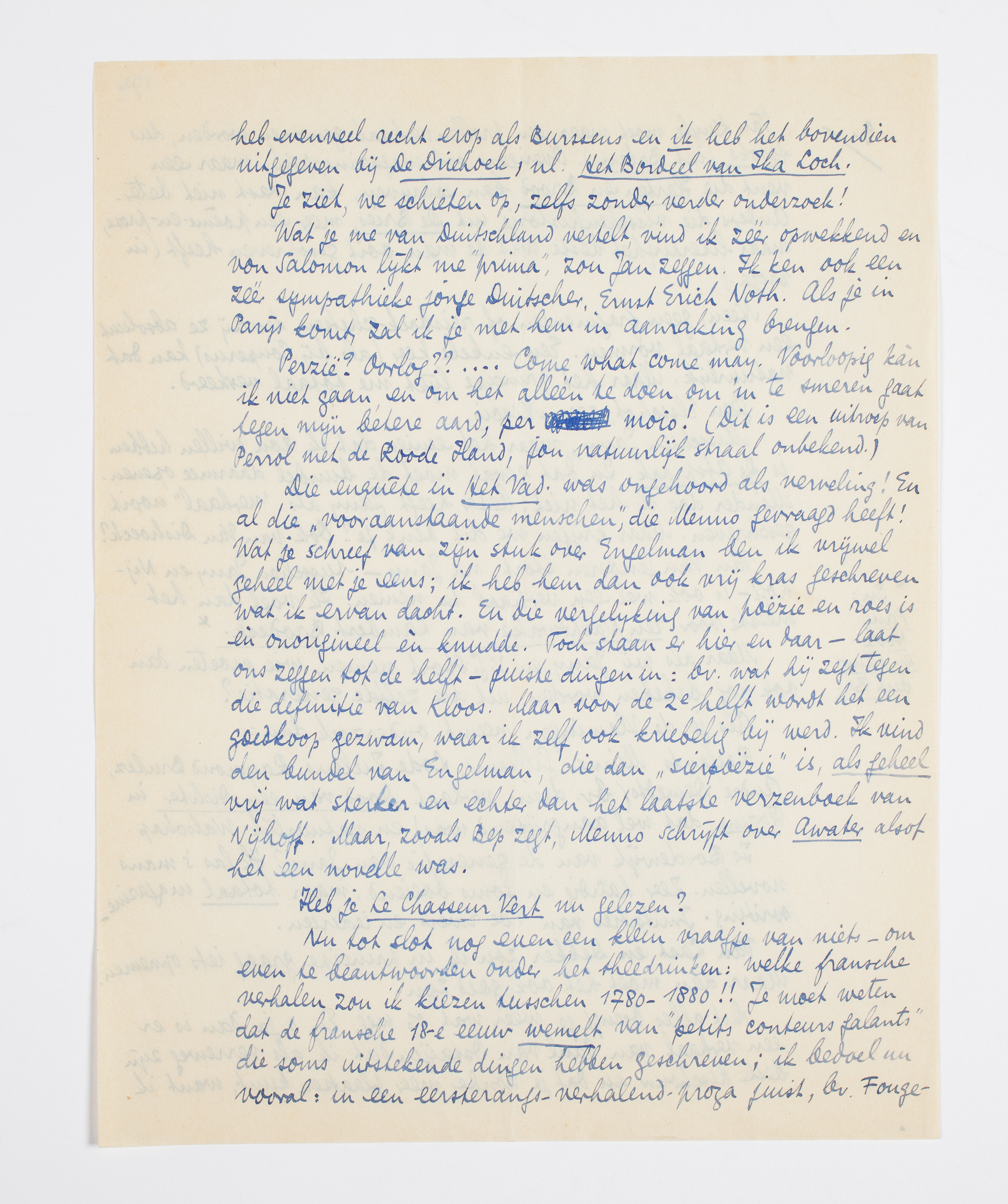 Die enquête in Het Vad. was ongehoord als verveling! En al die ‘vooraanstaande menschen’, die Menno gevraagd heeft! Wat je schreef van zijn stuk over Engelman ben ik vrijwel geheel met je eens; ik heb hem dan ook vrij kras geschreven wat ik ervan dacht.3503 En die vergelijking van poëzie en roes is èn onorigineel èn knudde. Toch staan er hier en daar - laat ons zeggen tot de helft - juiste dingen in: bv. wat hij zegt tegen die definitie van Kloos. Maar voor de 2e helft wordt het een goedkoop gezwam, waar ik zelf ook kriebelig bij werd. Ik vind den bundel van Engelman, die dan ‘sierpoëzie’ is, als geheel vrij wat sterker en echter dan het laatste verzenboek van Nijhoff. Maar, zooals Bep zegt, Menno schrijft over Awater alsof het een novelle was.