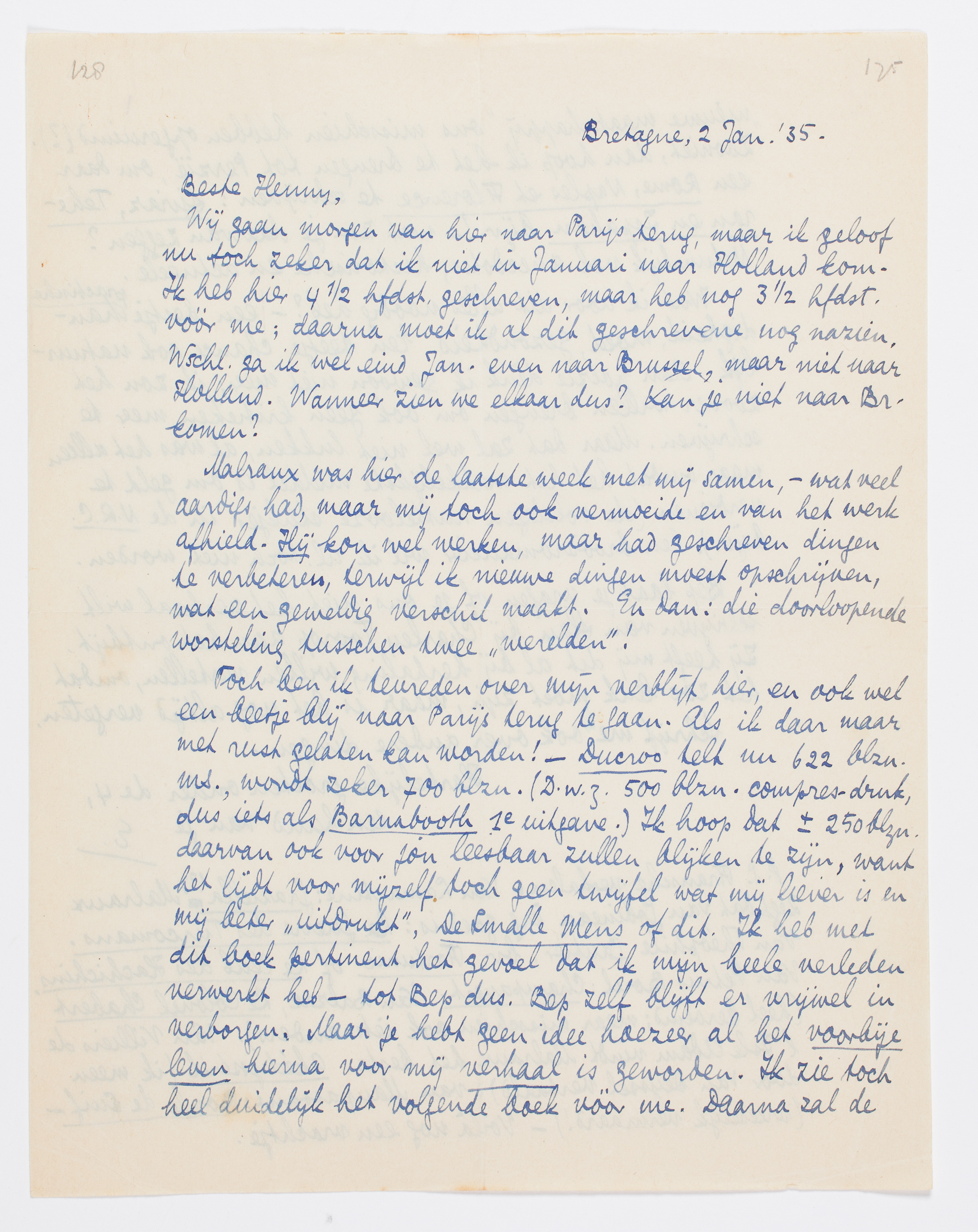 Malraux was hier de laatste week met mij samen, - wat veel aardigs had, maar mij toch ook vermoeide en van het werk afhield. Hij kon wel werken, maar had geschreven dingen te verbeteren, terwijl ik nieuwe dingen moest opschrijven, wat een geweldig verschil maakt. En dan: die doorloopende worsteling tusschen twee ‘werelden’!