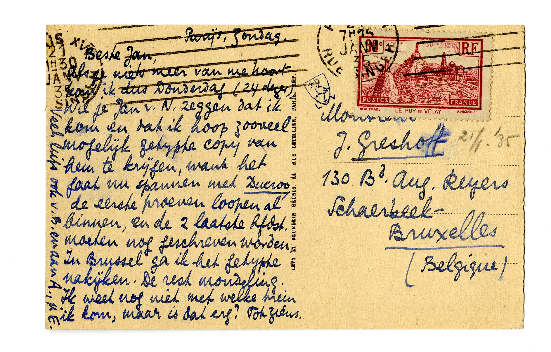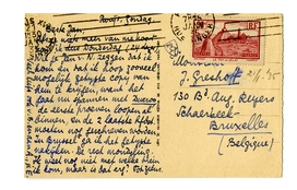 Als je niets meer van me hoort kom ik dus Donderdag (24 dezer). Wil je Jan v.N. zeggen dat ik kom en dat ik hoop zooveel mogelijk getypte copy van hem te krijgen, want het gaat nu spannen met Ducroo, de eerste proeven loopen al binnen, en de 2 laatste hfdst. moeten nog geschreven worden. In Brussel ga ik het getypte nakijken. De rest mondeling. Ik weet nog niet met welke trein ik kom, maar is dat erg? Tot ziens. Veel liefs ook v.B. en aan A., je