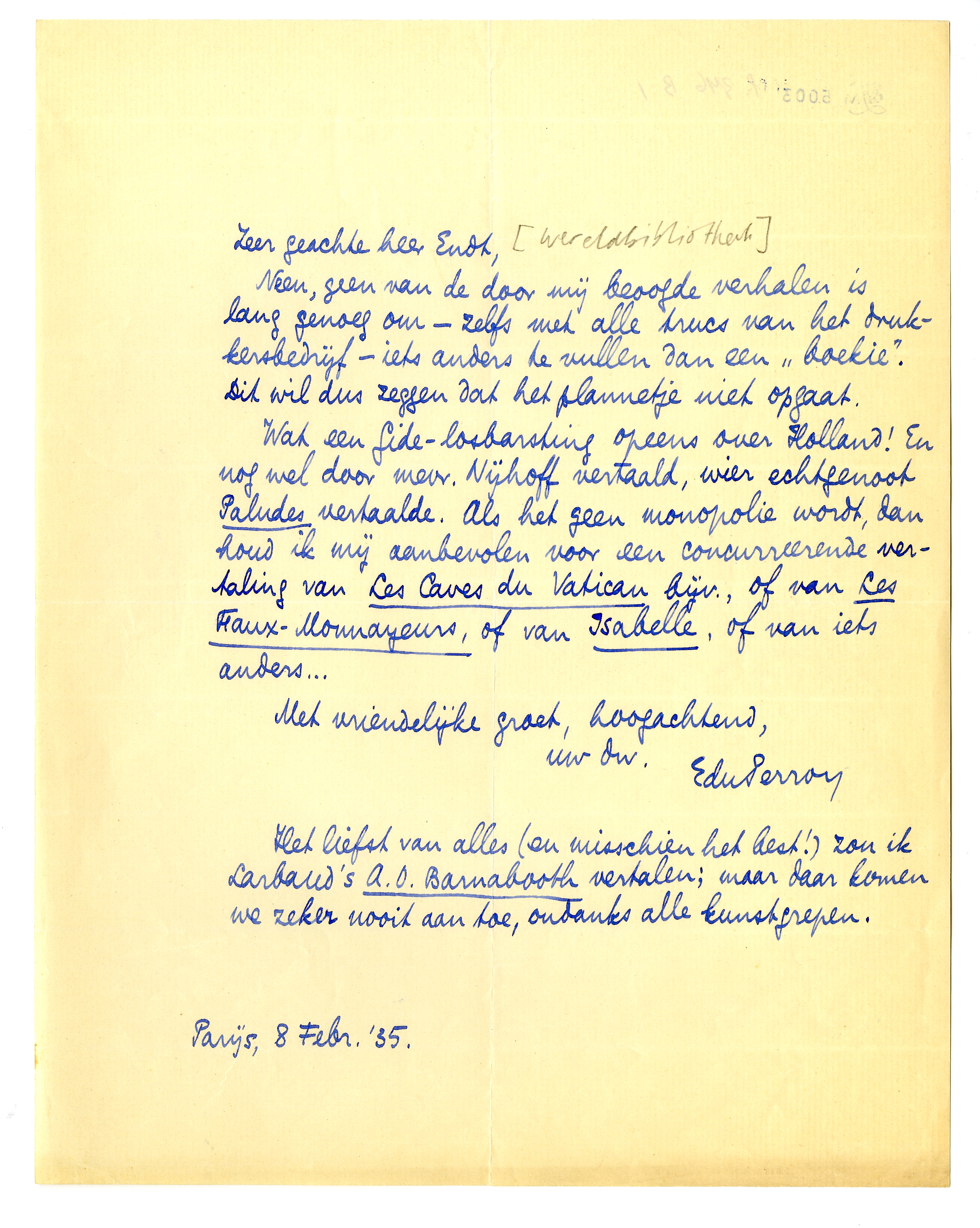 Wat een Gide-losbarsting opeens over Holland! En nog wel door mevr. Nijhoff vertaald wier echtgenoot Paludes vertaalde.3553 Als het geen monopolie wordt, dan houd ik mij aanbevolen voor een concurreerende vertaling van Les Capes du Vatican bijv., of van Les Faux-Monnayeurs, of van Isabelle, of van iets anders...