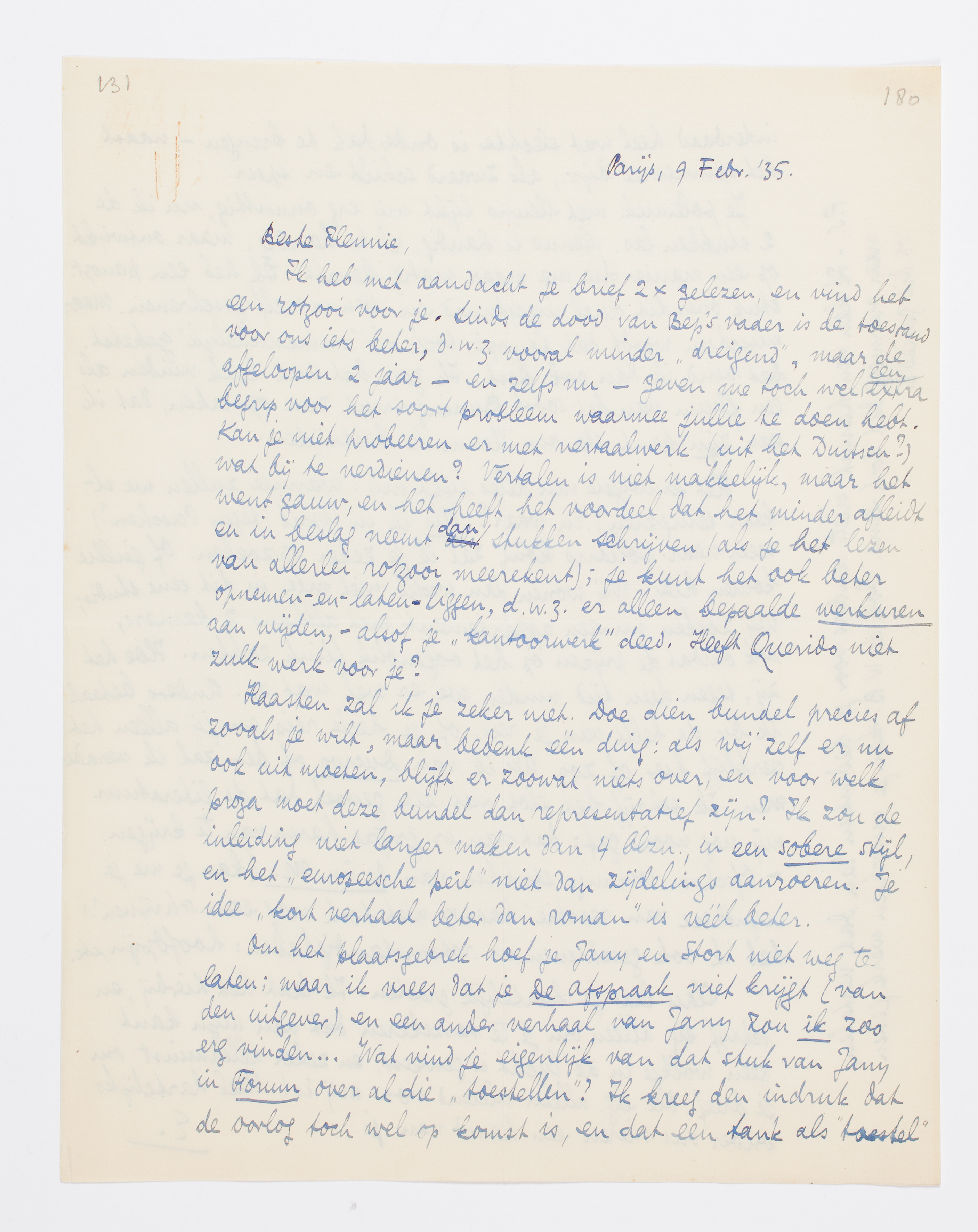 Haasten zal ik je zeker niet. Doe dien bundel precies af zoals je wilt, maar bedenk één ding: als wij zelf er nu ook uit moeten, blijft er zoowat niets over, en voor welk proza moet deze bundel dan representatief zijn? Ik zou de inleiding niet langer maken dan 4 blzn., in een sobere stijl, en het ‘europeesche peil’ niet dan zijdelings aanroeren. Je idee ‘kort verhaal beter dan roman’ is véél beter.