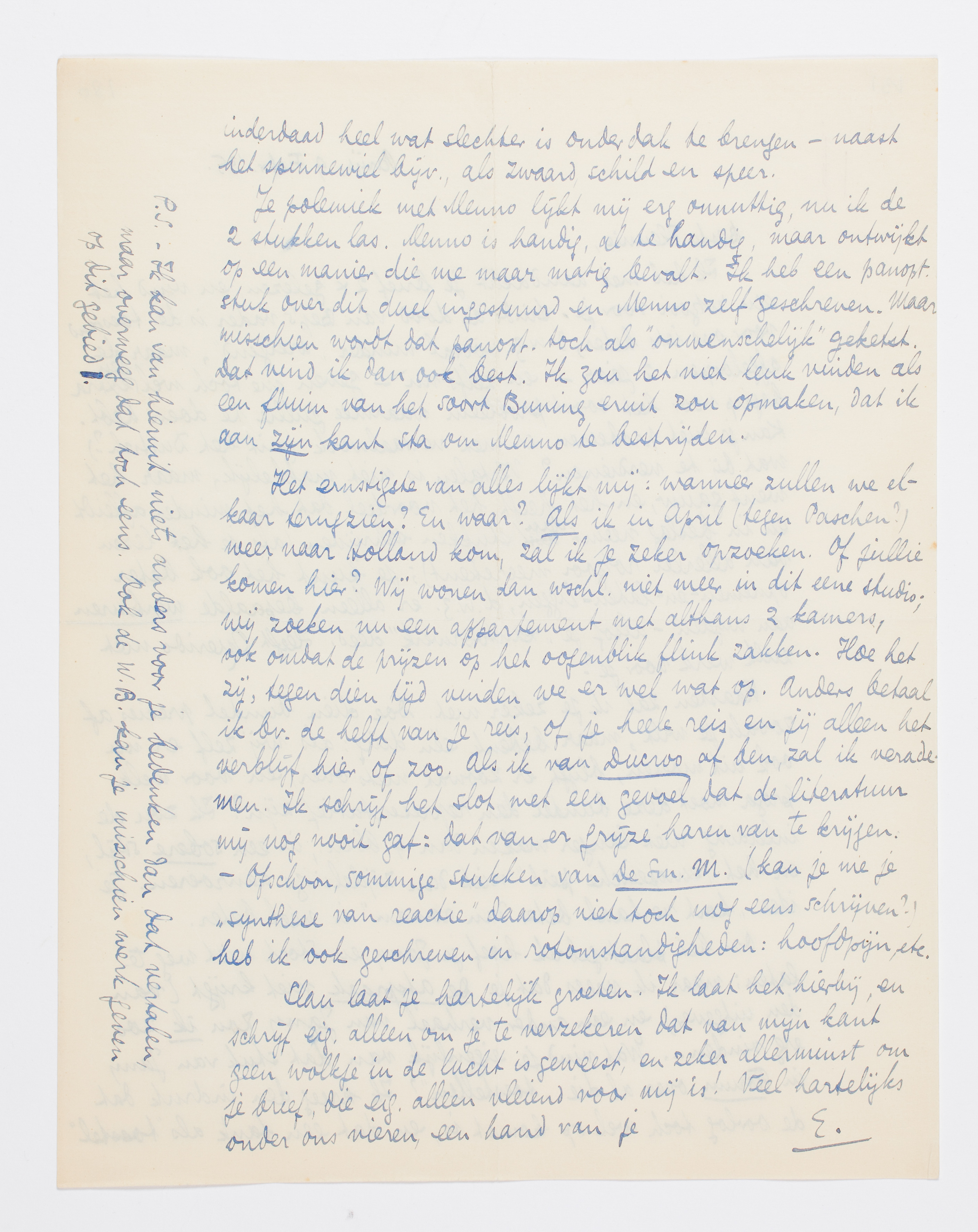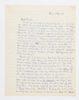 Het ernstigste van alles lijkt mij: wanneer zullen we elkaar terugzien? En waar? Als ik in April (tegen Paschen?) weer naar Holland kom, zal ik je zeker opzoeken. Of jullie komen hier? Wij wonen dan wschl. niet meer in dit eene studio; wij zoeken nu een appartement met althans 2 kamers, ook omdat de prijzen op het oogenblik flink zakken. Hoe het zij, tegen dien tijd vinden we er wel wat op. Anders betaal ik bv. de helft van je reis, of je heele reis en jij alleen het verblijf hier of zoo. Als ik van Ducroo af ben, zal ik verademen. Ik schrijf het slot met een gevoel dat de literatuur mij nog nooit gaf: dat van er grijze haren van te krijgen. - Ofschoon sommige stukken van De Sm. M. (kan je me je ‘synthese van reactie’ daarop niet toch nog eens schrijven?) heb ik ook geschreven in rotomstandigheden: hoofdpijn, etc.