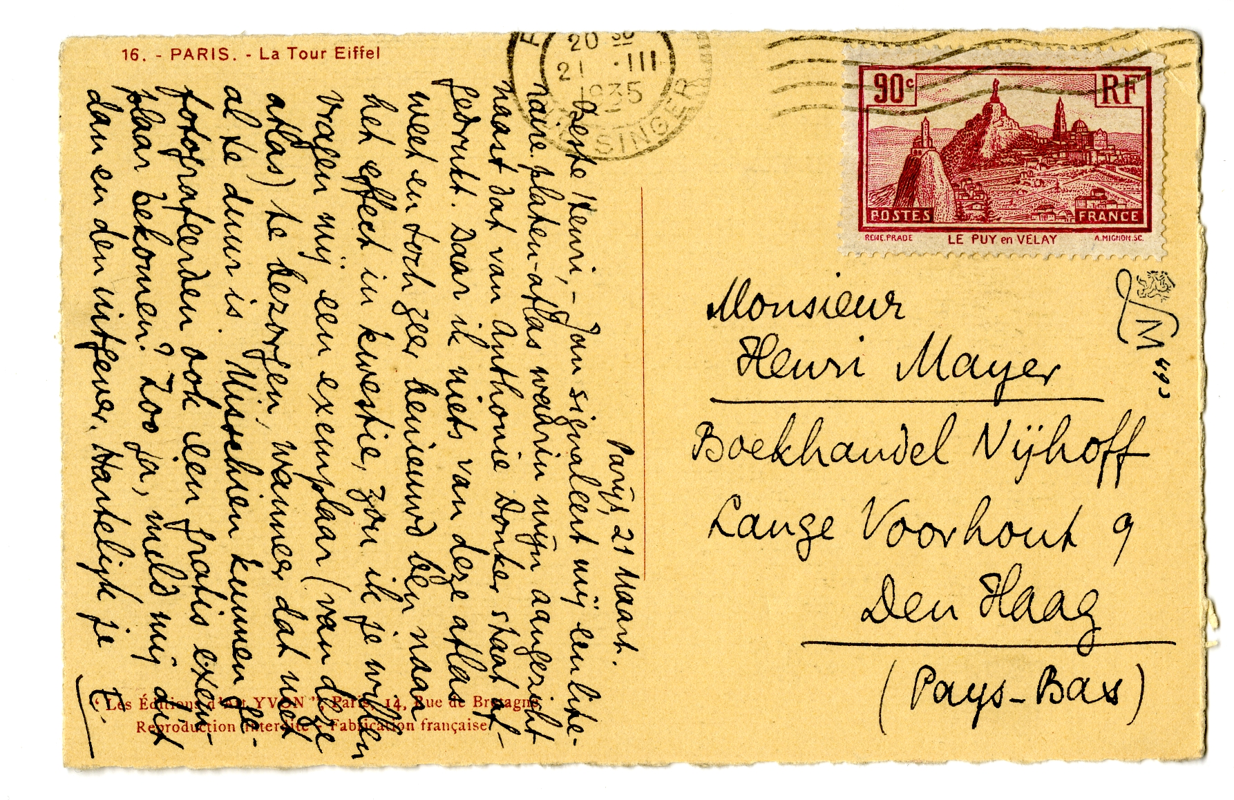 Beste Henri, - Jan signaleert mij een literaire platen-atlas waarin mijn aangezicht naast dat van Anthonie Donker3594 staat afgedrukt. Daar ik niets van deze atlas weet en toch zeer benieuwd ben naar het effect in kwestie, zou ik je willen vragen mij een exemplaar (van deze atlas) te bezorgen, wanneer dat niet al te duur is. Misschien kunnen gefotografeerden ook een gratis exemplaar bekomen? Zoo ja, meld mij dit dan en den uitgever. Hartelijk je
