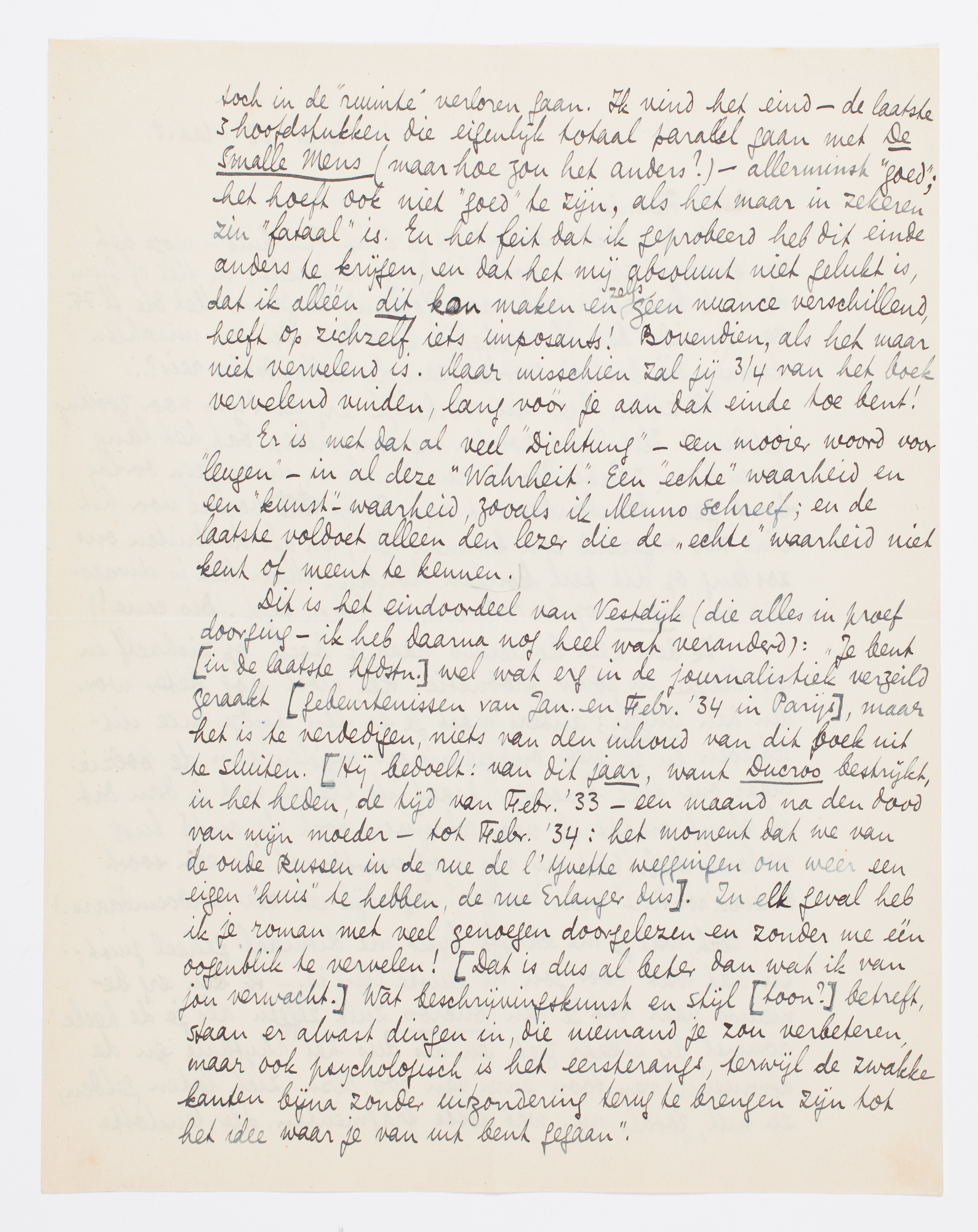 Dit is het eindoordeel van Vestdijk (die alles in proef doorging - ik heb daarna nog heel wat veranderd): ‘Je bent in [de laatste hfdstn] wel wat erg in de journalistiek verzeild geraakt [gebeurtenissen van Jan. en Febr. '34 in Parijs], maar het is te verdedigen, niets van den inhoud van dit boek uit te sluiten. [Hij bedoelt: van dit jaar, want Ducroo bestrijkt, in het heden, de tijd van Febr. '33 - een maand na den dood van mijn moeder - tot Febr. '34: het moment dat we van de oude Russen in de rue de l'Yvette weggingen om weer een eigen “huis” te hebben, de rue Erlanger dus]. In elk geval heb ik je roman met veel genoegen doorgelezen en zonder me één oogenblik te vervelen! [Dat is dus al beter dan wat ik van jou verwacht.] Wat beschrijvingskunst en stijl [toon?] betreft, staan er alvast dingen in, die niemand je zou verbeteren, maar ook psychologisch is het eersterangs, terwijl de zwakke kanten bijna zonder uitzondering terug te brengen zijn tot het idee waar je van uit bent gegaan’.