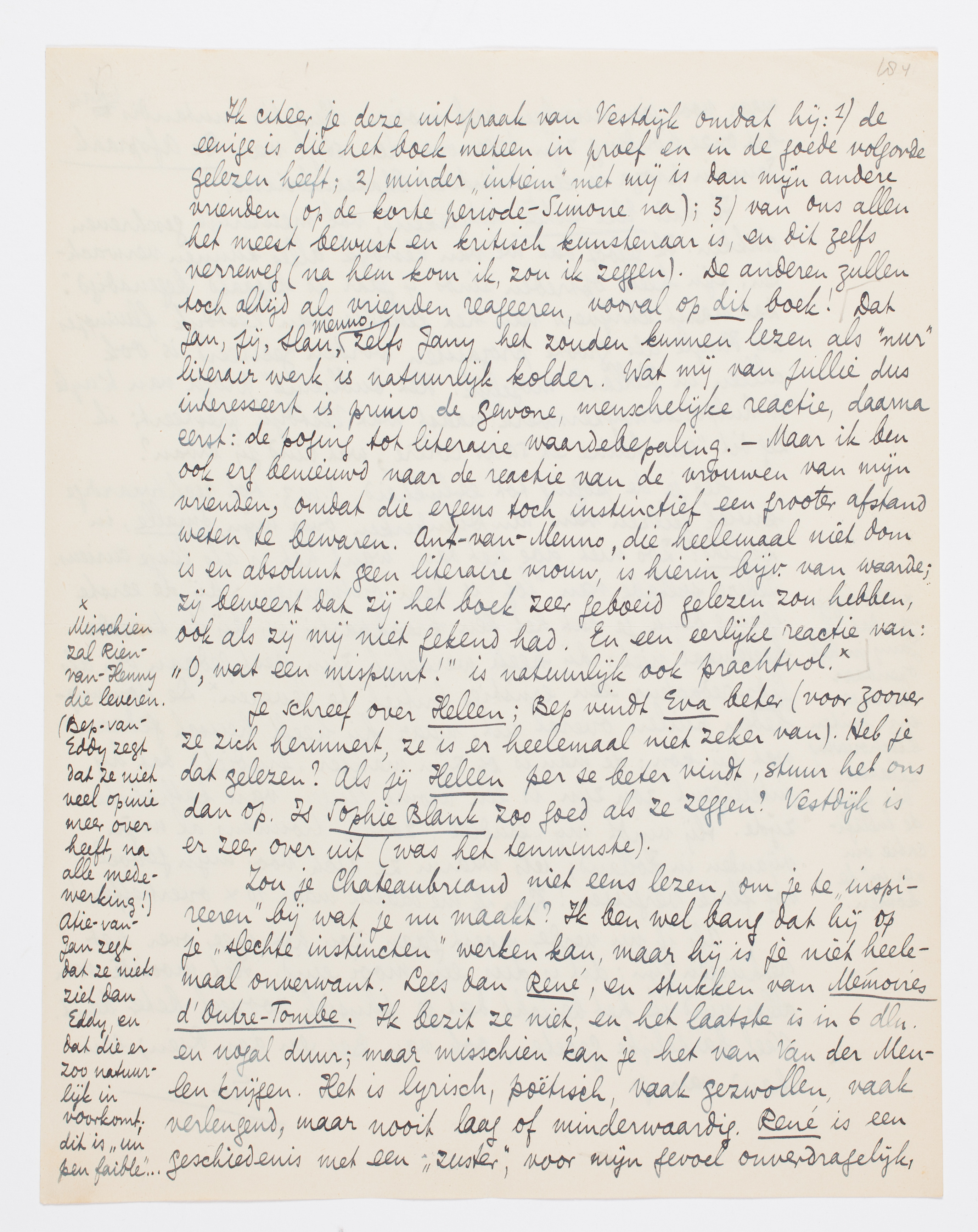 Ik citeer je deze uitspraak van Vestdijk omdat hij: 1) de eenige is die het boek meteen in proef en in de goede volgorde gelezen heeft; 2) minder ‘intiem’ met mij is dan mijn andere vrienden (op de korte periode-Simone na); 3) van ons allen het meest bewust en kritisch kunstenaar is, en dit zelfs verreweg (na hem kom ik, zou ik zeggen). De anderen zullen toch altijd als vrienden reageeren, vooral op dit boek! Dat Jan, jij, Slau, Menno, zelfs Jany het zouden kunnen lezen als ‘nur’ literair werk is natuurlijk kolder. Wat mij van jullie dus inte-resseert is primo de gewone, menschelijke reactie, daarna eerst: de poging tot literaire waardebepaling. - Maar ik ben ook erg benieuwd naar de reactie van de vrouwen van mijn vrienden, omdat die ergens toch instinctief een grooter afstand weten te bewaren. Ant-van-Menno, die heelemaal niet dom is en absoluut geen literaire vrouw, is hierin bijv. van waarde; zij beweert dat zij het boek zeer geboeid gelezen zou hebben, ook als zij mij niet gekend had. En een eerlijke reactie van: ‘O, wat een mispunt!’ is natuurlijk ook prachtvol.*