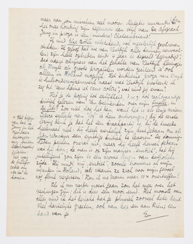 Toch, wat je me schrijft lijkt me ditmaal geheel juist; en dat wat voor jou ‘de juiste lijn’ is. - Ik ben erg benieuwd naar wat je van Ducroo zult zeggen als je de heele rommel bij elkaar ziet, en als dus het rhythme en de afwisseling van toon enz. van 500 blzn. zich laten gelden, en niet, zooals nu, wat losse fragmenten, die tenslotte toch in de ‘ruimte’ verloren gaan. Ik vind het eind - de laatste 3 hoofdstukken die eigenlijk totaal parallel gaan met De Smalle Mens (maar hoe zou het anders?) - allerminst ‘goed’; het hoeft ook niet ‘goed’ te zijn, als het maar in zekeren zin ‘fataal’ is. En het feit dat ik geprobeerd heb dit einde anders te krijgen, en dat het mij absoluut niet gelukt is, dat ik alléén dit kon maken en zelfs geen nuance verschillend, heeft op zichzelf iets imposants! Bovendien, als het maar niet vervelend is. Maar misschien zal jij ¾ van het boek vervelend vinden, lang vóór je aan het einde toe bent!