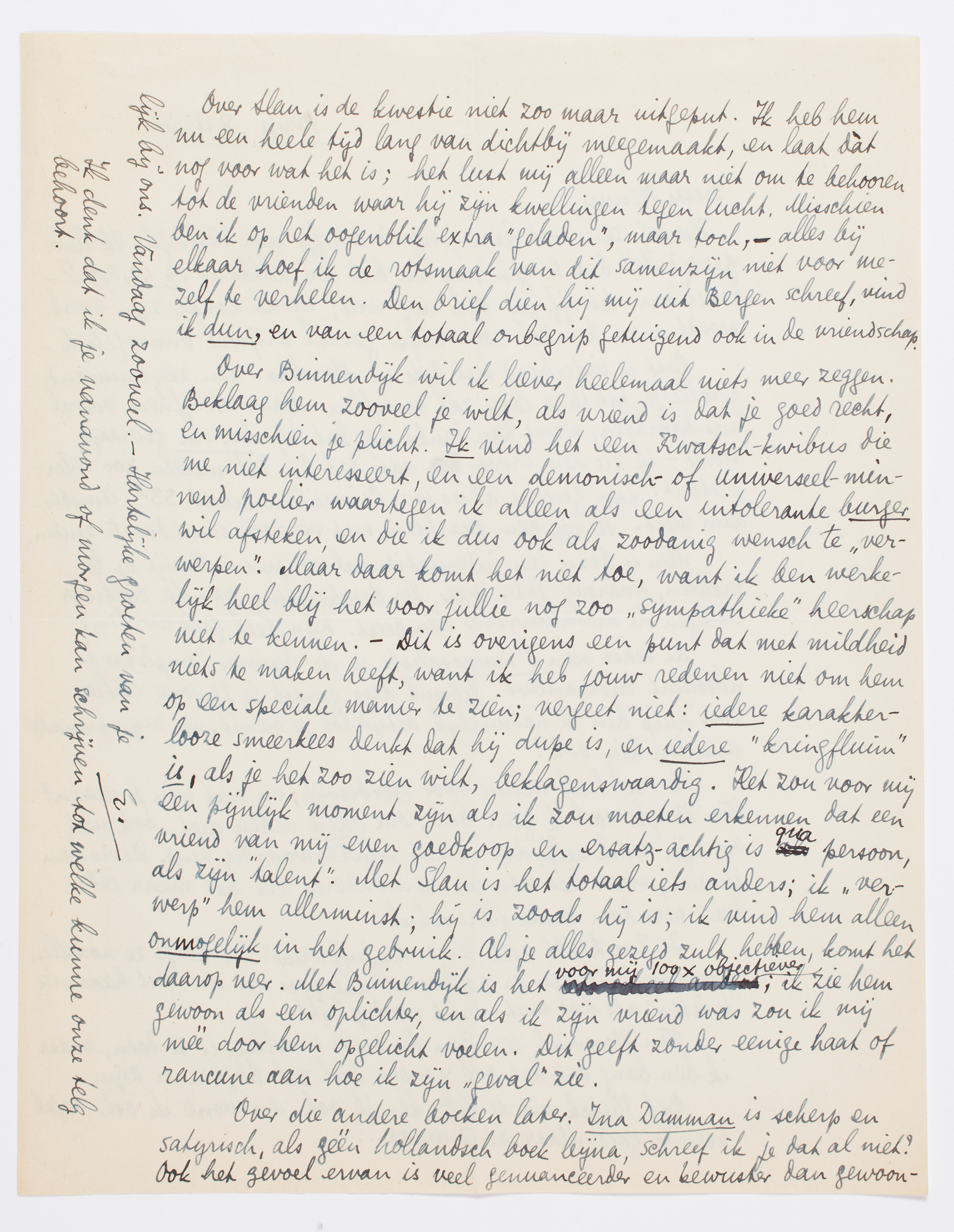 Over Binnendijk wil ik liever heelemaal niets meer zeggen. Beklaag hem zooveel je wilt, als vriend is dat je goed recht, en mis-schien je plicht. Ik vind het een Kwatsch-kwibus die me niet interesseert, en een demonisch- of universeelminnend poelier waartegen ik alleen als een intolerante burger wil afsteken, en die ik dus ook als zoodanig wensch te ‘verwerpen’. Maar daar komt het niet toe, want ik ben werkelijk heel blij het voor jullie nog zoo ‘sympathieke’ heerschap niet te kennen. - Dit is overigens een punt dat met mildheid niets te maken heeft, want ik heb jouw redenen niet om hem op een speciale manier te zien; vergeet niet: iedere karakterlooze smeerkees denkt dat hij dupe is, en iedere ‘kringfluim’ is, als je het zoo zien wilt, beklagenswaardig. Het zou voor mij een pijnlijk moment zijn als ik zou moeten erkennen dat een vriend van mij even goedkoop en ersatz-achtig is qua persoon, als zijn ‘talent’. Met Slau is het totaal iets anders; ik ‘verwerp’ hem allerminst; hij is zooals hij is; ik vind hem alleen onmogelijk in het gebruik. Als je alles gezegd zult hebben, komt het daarop neer. Met Binnendijk is het voor mij 100 × objectiever; ik zie hem gewoon als een oplichter, en als ik zijn vriend was zou ik mij méé door hem opgelicht voelen. Dit geeft zonder eenige haat of rancune aan hoe ik zijn ‘geval’ zie.