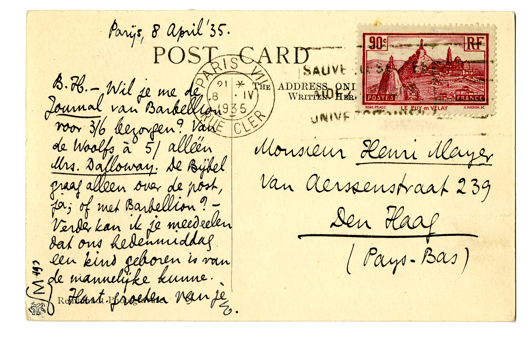 B.H. - Wil je me de Journal van Barbellion voor 3/6 bezorgen? Van de Woolfs à 5/ alléén Mrs. Dalloway. De Bijbel graag alleen over de post, ja; of met Barbellion? - Verder kan ik je meedeelen dat ons hedenmiddag een kind geboren is van de mannelijke kunne.