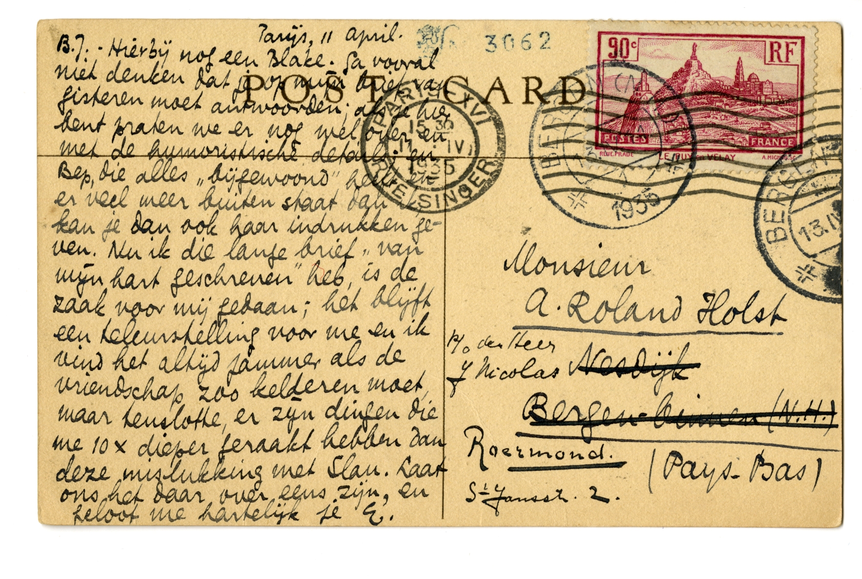 B.J. Hierbij nog een Blake. Ga vooral niet denken dat je op mijn brief van gisteren moet antwoorden; als je hier bent praten we er nog wel over en met de humoristische details; en Bep, die alles ‘bijgewoond’ heeft en er veel meer buiten staat dan ik, kan je dan ook haar indrukken geven. Nu ik die lange brief ‘van mijn hart geschreven’ heb, is de zaak voor mij gedaan; het blijft een teleurstelling voor me en ik vind het altijd jammer als de vriendschap zoo kelderen moet, maar tenslotte, er zijn dingen die me 10 × dieper geraakt hebben dan deze mislukking met Slau. Laat ons daar over eens zijn, geloof me hartelijk je