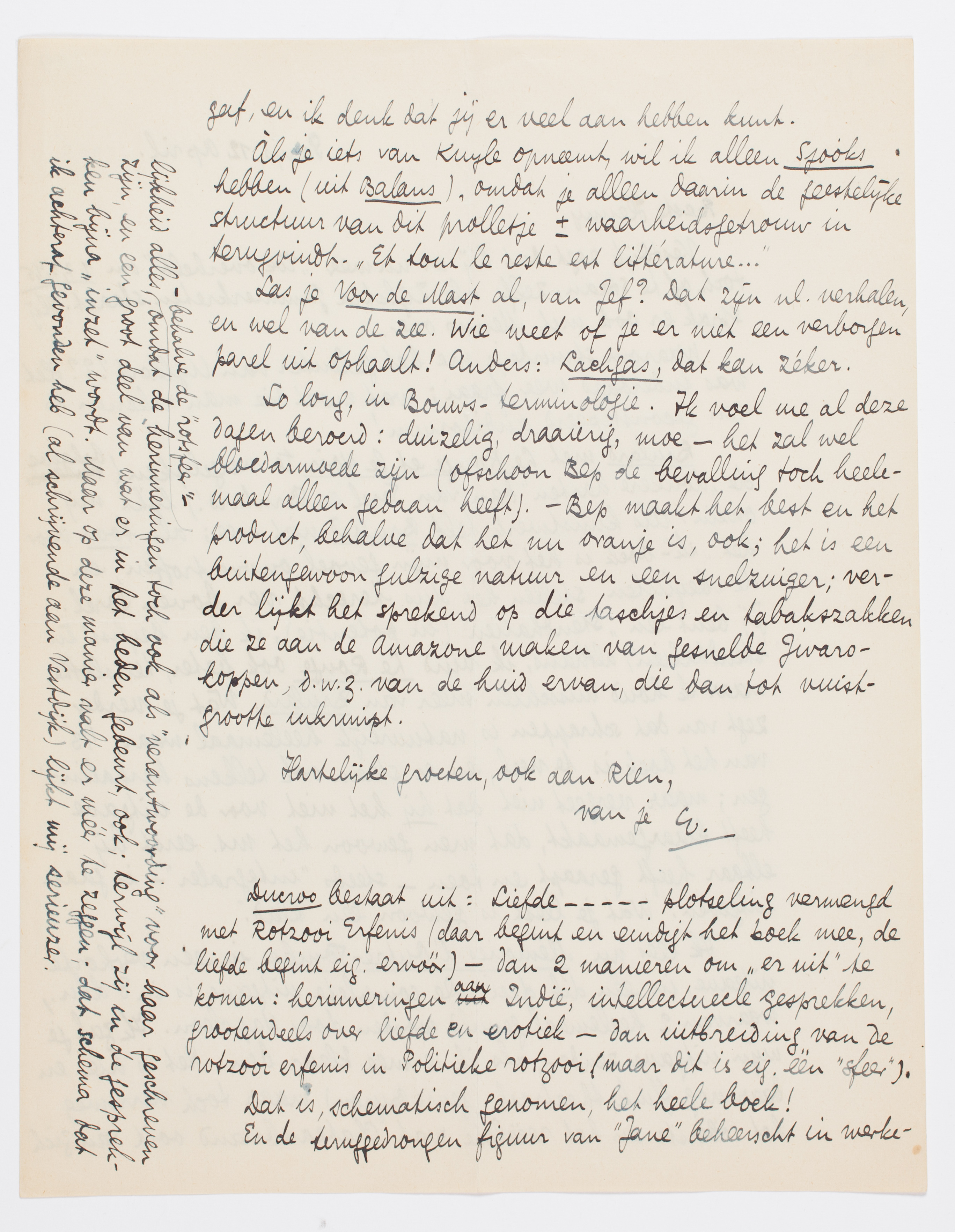 So long, in Bouws-terminologie. Ik voel me al deze dagen beroerd: duizelig, draaierig, moe - het zal wel bloedarmoede zijn (ofschoon Bep de bevalling toch heelemaal alleen gedaan heeft). - Bep maakt het best en het product, behalve dat het nu oranje is, ook; het is een buitengewoon gulzige natuur en een snelzuiger; verder lijkt het sprekend op die taschjes en tabakszakken die ze aan de Amazone maken van gesnelde Jivarokoppen, d.w.z. van de huid ervan, die dan tot vuistgrootte inkrimpt.