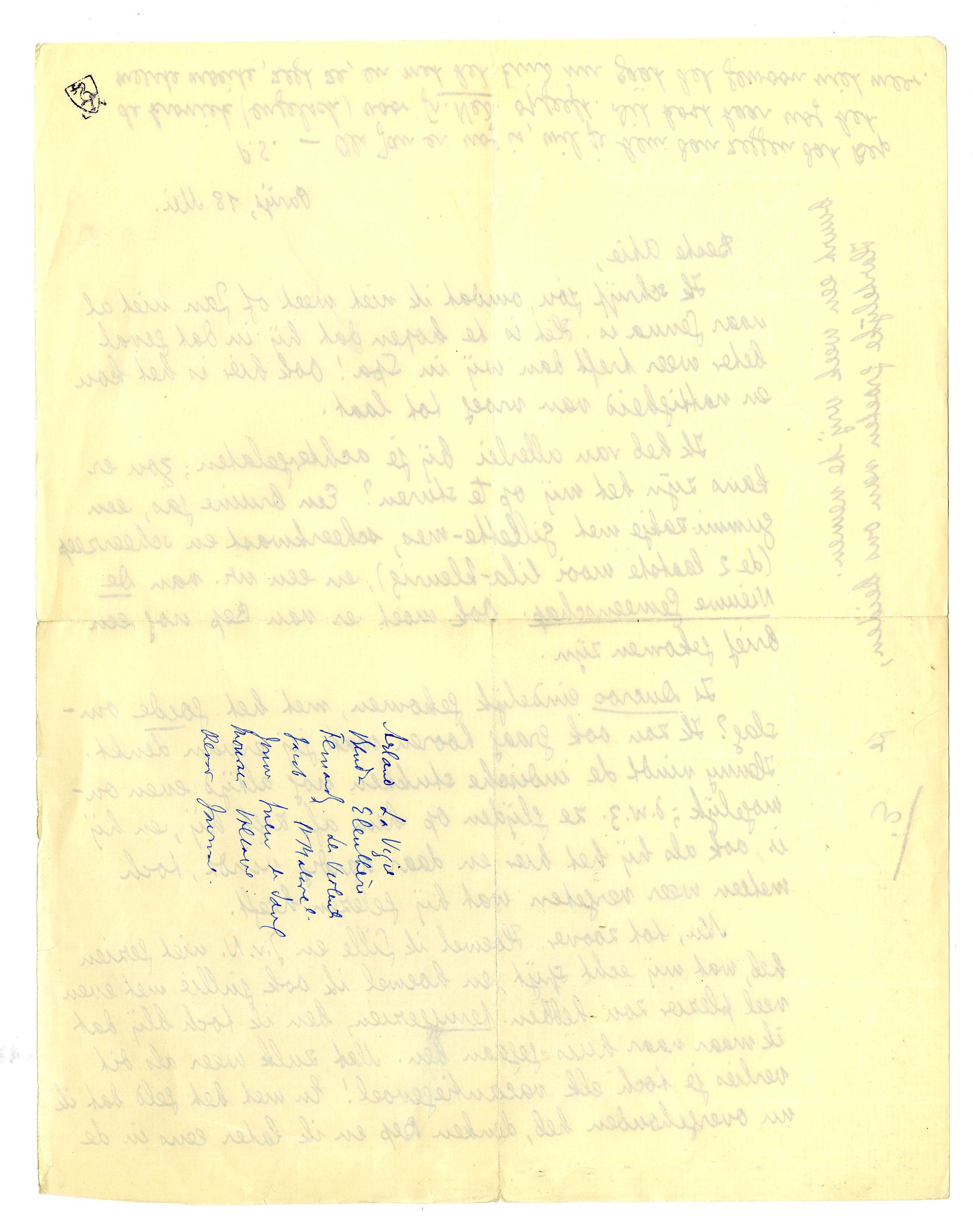Ik heb van allerlei bij je achtergelaten; zou er kans zijn het mij op te sturen? Een bruine jas, een gummi-zakje met Gillette-mes, scheerkwast en scheerzeep (de laatste 2 mooi lila-kleurig), en een nr. van De Nieuwe Gemeenschap. Ook moet er van Bep nog een brief gekomen zijn.