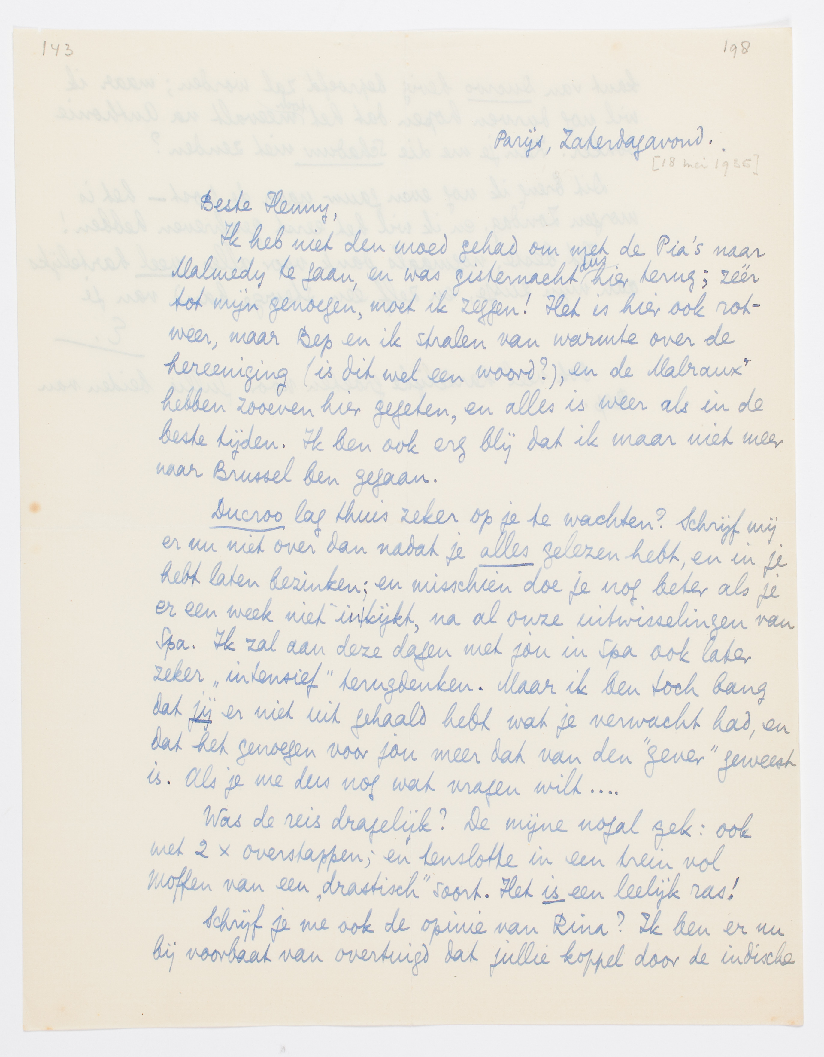 Ik heb niet den moed gehad om met de Pia's naar Malmédy te gaan, en was gisternacht dus hier terug; zéér tot mijn genoegen, moet ik zeggen! Het is hier ook rotweer, maar Bep en ik stralen van warmte over de hereeniging (is dit wel een woord?), en de Malraux' hebben zooeven hier gegeten, en alles is weer als in de beste tijden. Ik ben ook erg blij dat ik maar niet meer naar Brussel ben gegaan.
