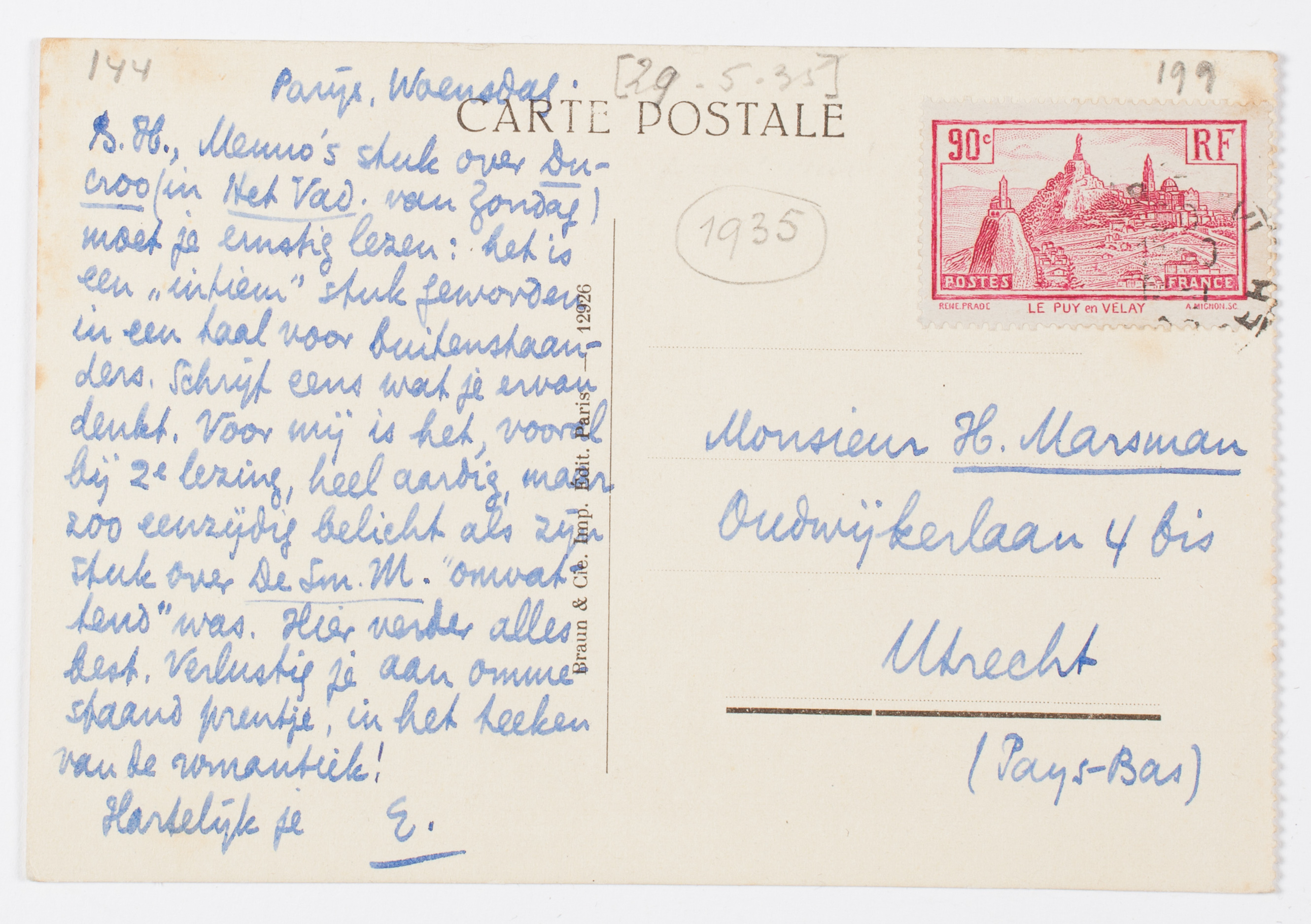 B.H., Menno's stuk over Ducroo (in Het Vad. van Zondag) moet je ernstig lezen: het is een ‘intiem’ stuk geworden in een taal voor buitenstaanders. Schrijf eens wat je ervan denkt. Voor mij is het, vooral bij 2e lezing, heel aardig, maar zoo eenzijdig belicht als zijn stuk over De Sm. M. ‘omvattend’ was. Hier verder alles best. Verlustig je aan ommestaand prentje, in het teeken van de romantiek!
