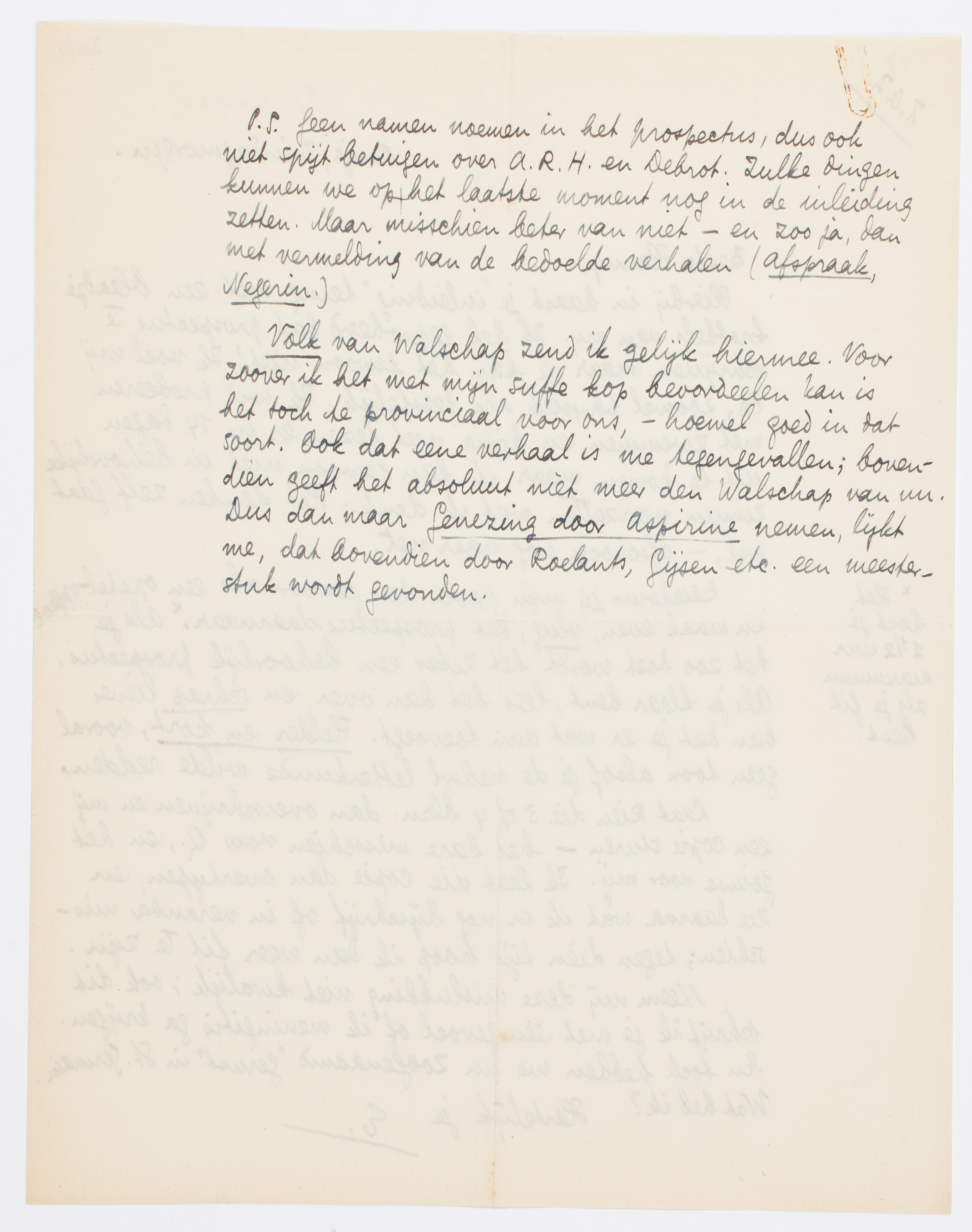 P.S. Geen namen noemen in het prospectus, dus ook niet spijt betuigen over A.R.H. en Debrot. Zulke dingen kunnen we op het laatste moment nog in de inleiding zetten. Maar misschien beter van niet - en zoo ja, dan met vermelding van de bedoelde verhalen (Afspraak, Negerin.)