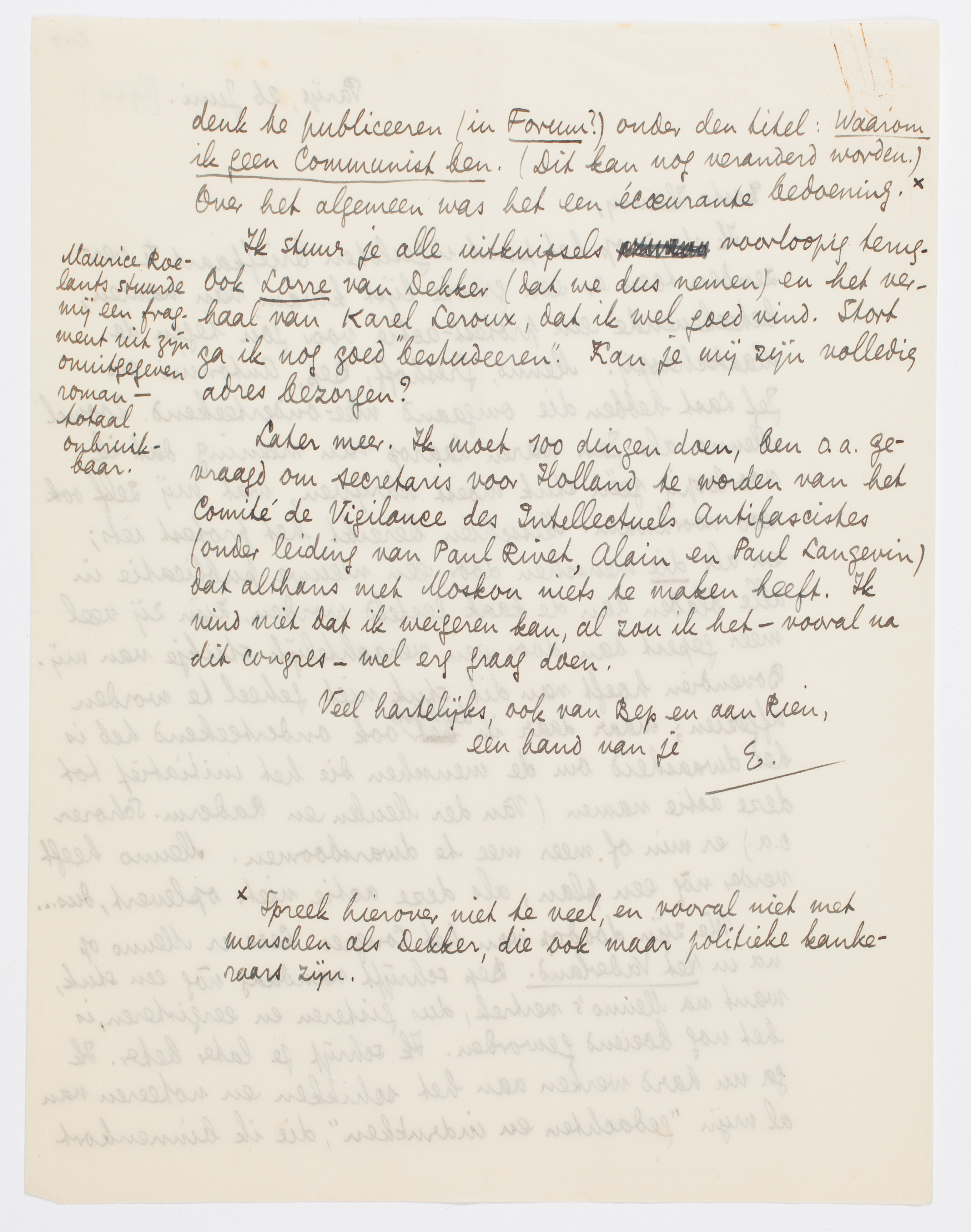 We zijn doodop van het Congres. Lees er Menno op na in Het Vaderland.3783 Bep schrijft vandaag nòg een stuk,3784 want na Menno's vertrek, dus gisteren en eergisteren, is het nog boeiend geworden. Ik schrijf je later beter. Ik ga nu hard werken aan het schikken en noteeren van al mijn ‘gedachten en indrukken’, die ik binnenkort denk te publiceeren (in Forum?)3785 onder den titel: Waarom ik geen Communist ben. (Dit kan nog veranderd worden.) Over het algemeen was het een écoeurante bedoening.*
