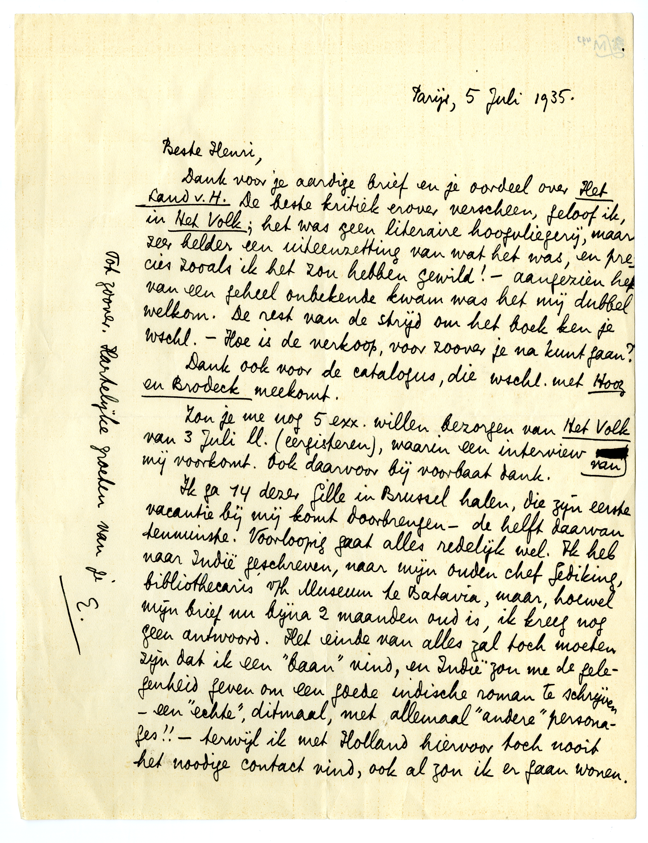 Dank voor je aardige brief en je oordeel over Het Land v. H. De beste kritiek erover verscheen, geloof ik, in Het Volk; het was geen literaire hoogvliegerij, maar zeer helder een uiteenzetting van wat het was, en precies zooals ik het zou hebben gewild! - aangezien het van een geheel onbekende kwam was het mij dubbel welkom. De rest van de strijd om het boek ken je wschl. - Hoe is de verkoop, voor zoover je na kunt gaan?